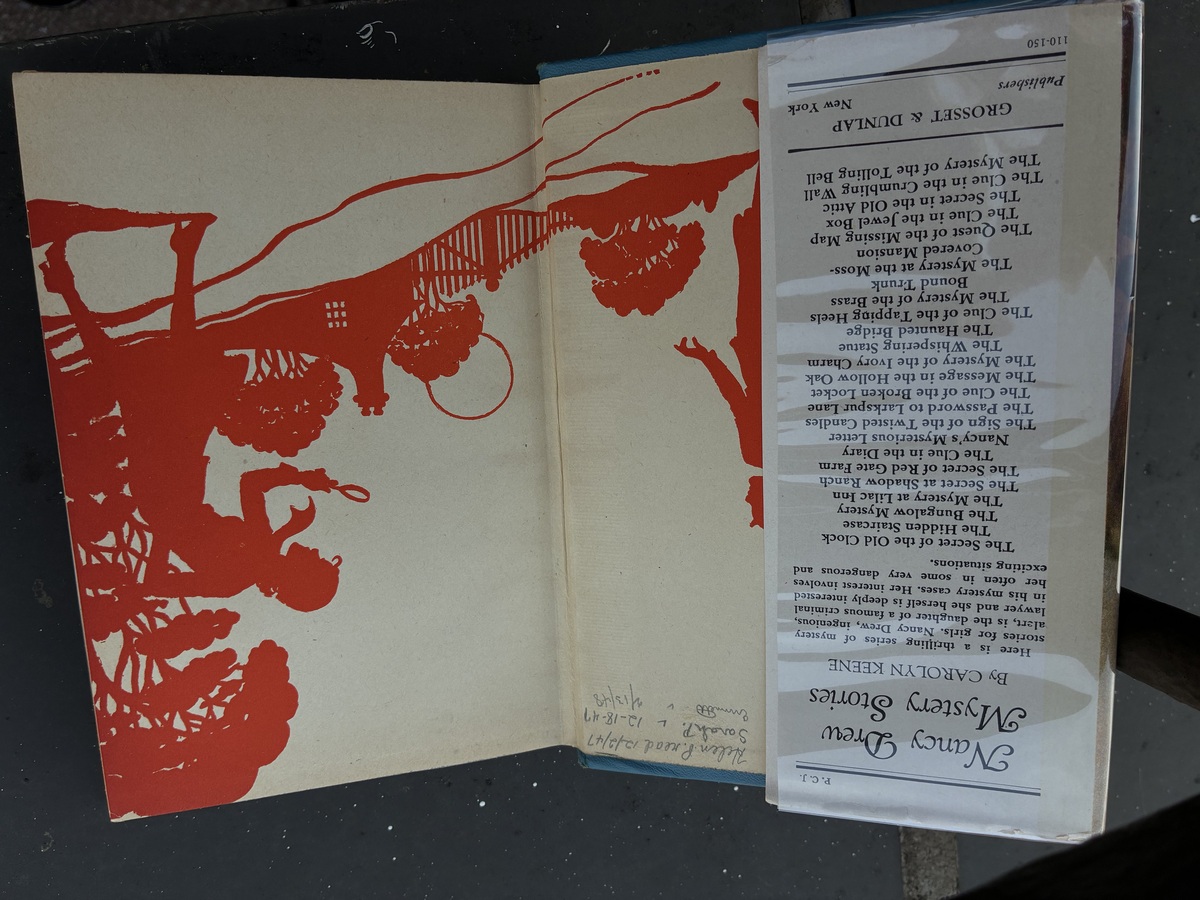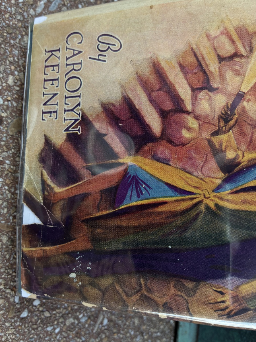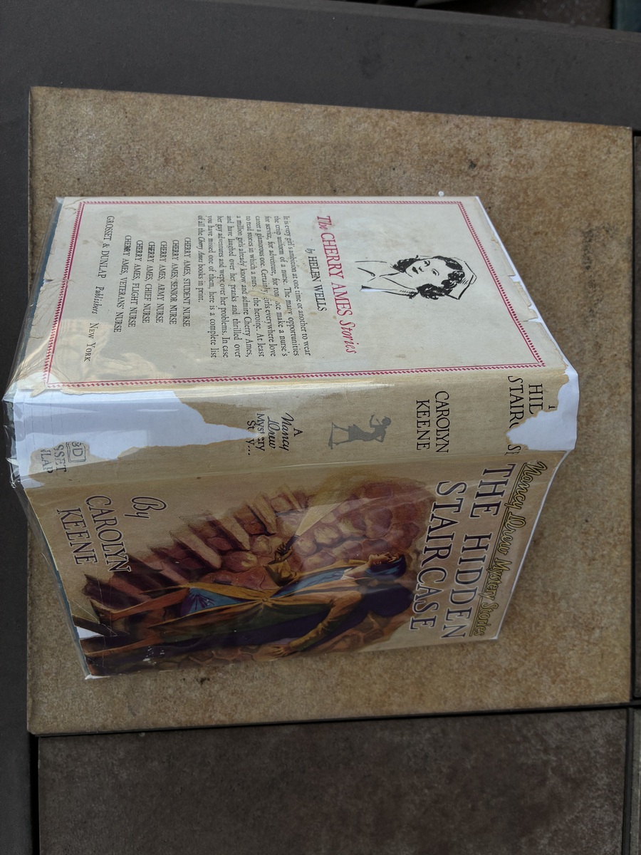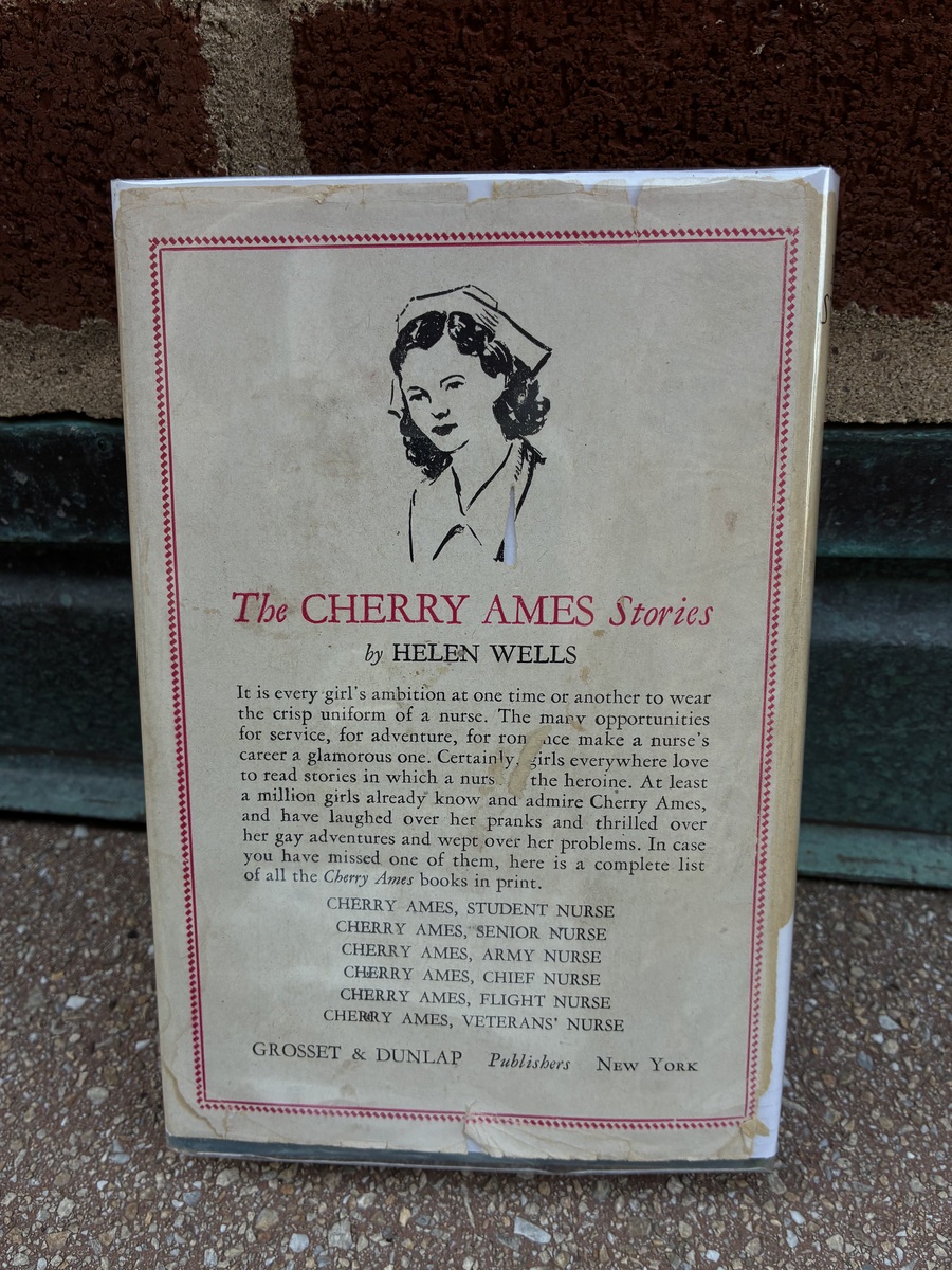 Dust jacket has large chunks missing from white spine. Rear dj lists to Cherry Ames #6 Veterans' Nurse. Rear dj flap lists to Dana Girls #12 Portrait in the Sand. Front flap has "P.C.J." designation and lists to Tolling Bell.