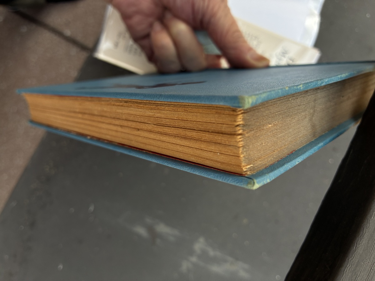 Page foxing (might be war-time paper, but there's no designation it is) and prior owner names on endpaper, but otherwise a very nice, square and tight book with only very slight spine slant. Good binding. Orange silhouette endpapers.