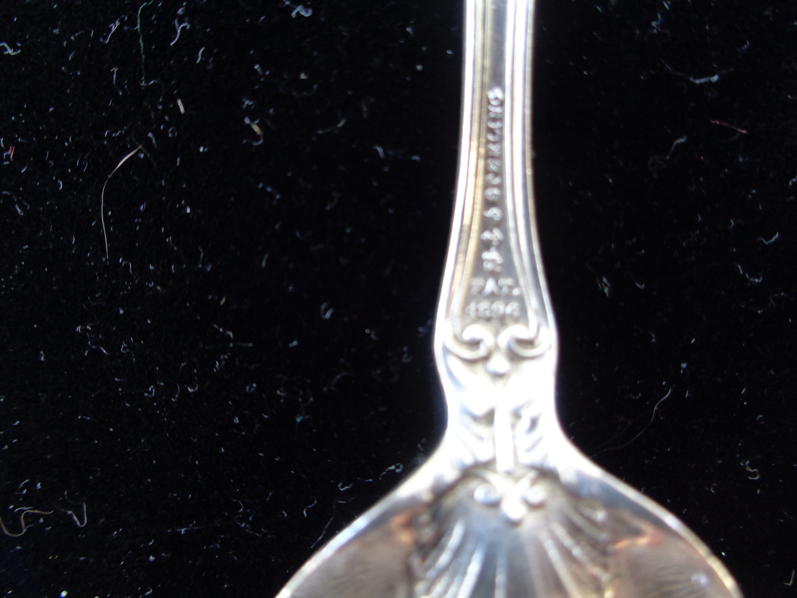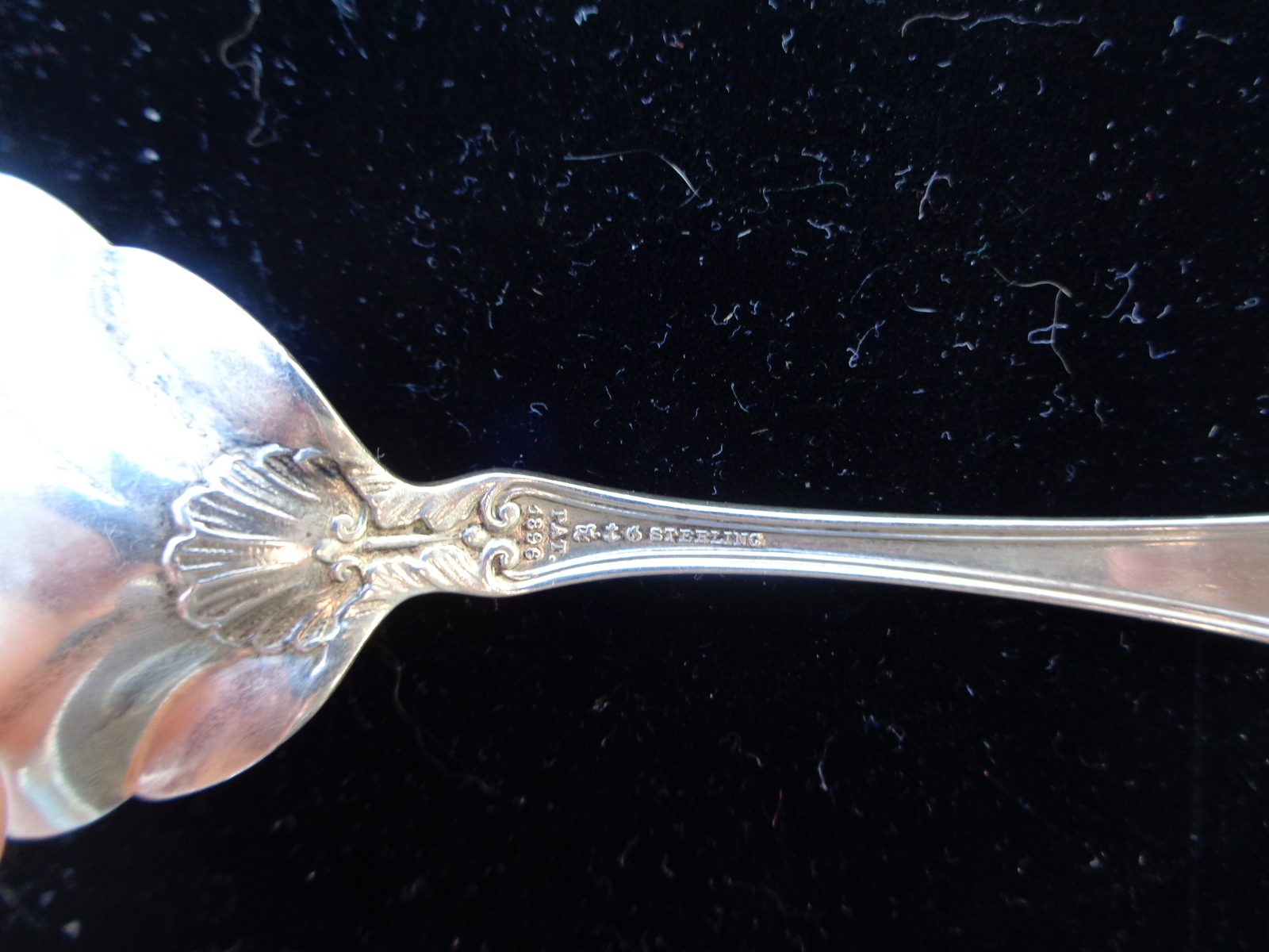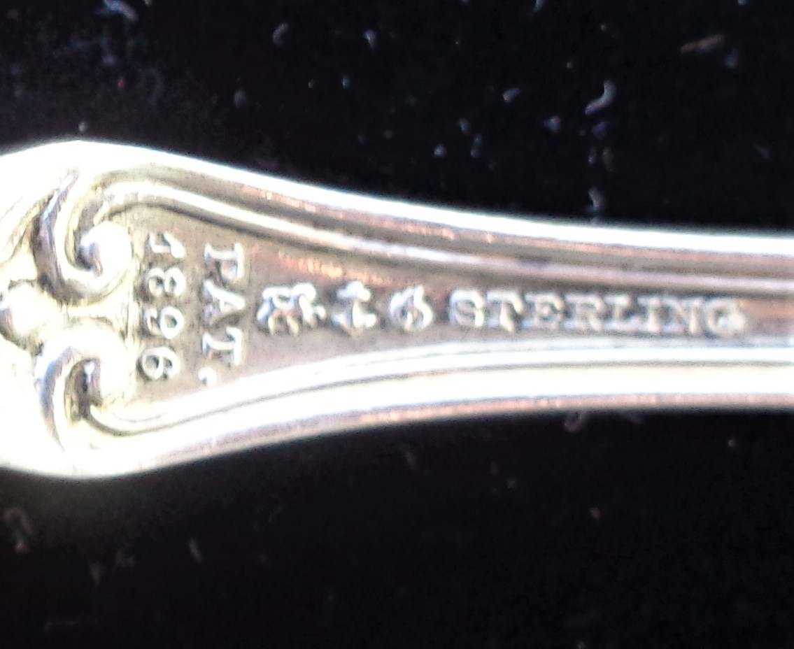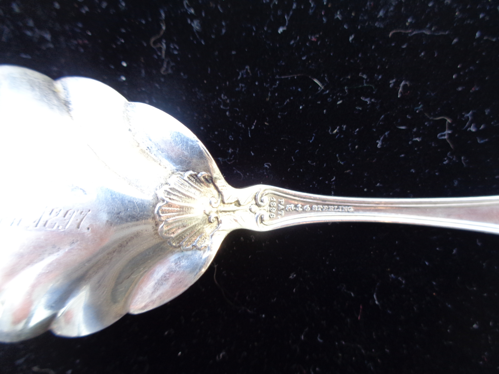 This lovely scalloped serving spoon has written on the back of it's bowl in beautiful Script: "From E. Hansen 1897." On the upper top part of the back side of the spoon, written in the same script, yet smaller, is written "Willows," meaning unknown. On the lower end of the stem is stamped "PAT 1896". and then the word, "sterling". It's pretty amazing to get a spoon with this much detailed provenance that gives us the exact date as well as a personalized message, however cryptic. The overall weight is 25 grams, which makes it just 3 grams shy of an ounce. The overall condition is remarkable, especially considering that it is 123 years old!