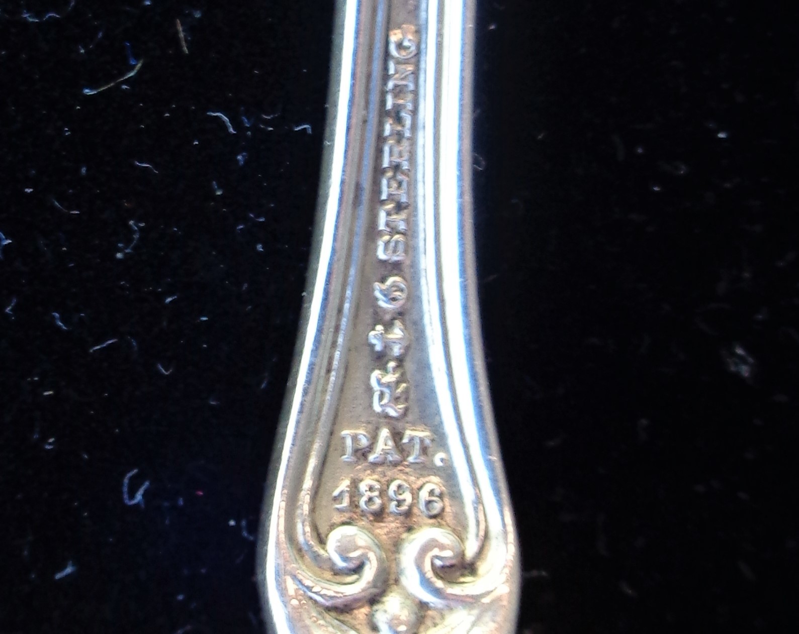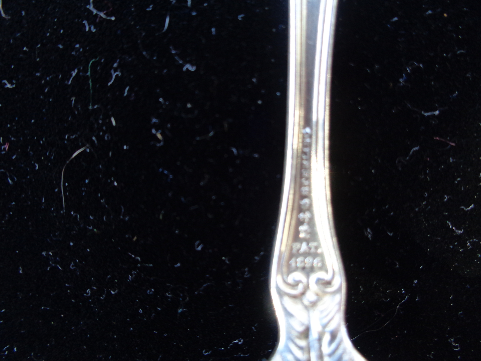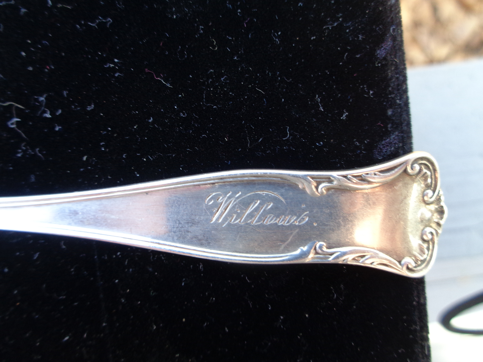 This lovely scalloped serving spoon has written on the back of it's bowl in beautiful Script: "From E. Hansen 1897." On the upper top part of the back side of the spoon, written in the same script, yet smaller, is written "Willows," meaning unknown. On the lower end of the stem is stamped "PAT 1896". and then the word, "sterling". It's pretty amazing to get a spoon with this much detailed provenance that gives us the exact date as well as a personalized message, however cryptic. The overall weight is 25 grams, which makes it just 3 grams shy of an ounce. The overall condition is remarkable, especially considering that it is 123 years old!