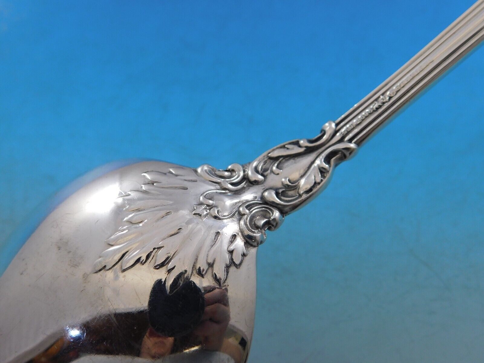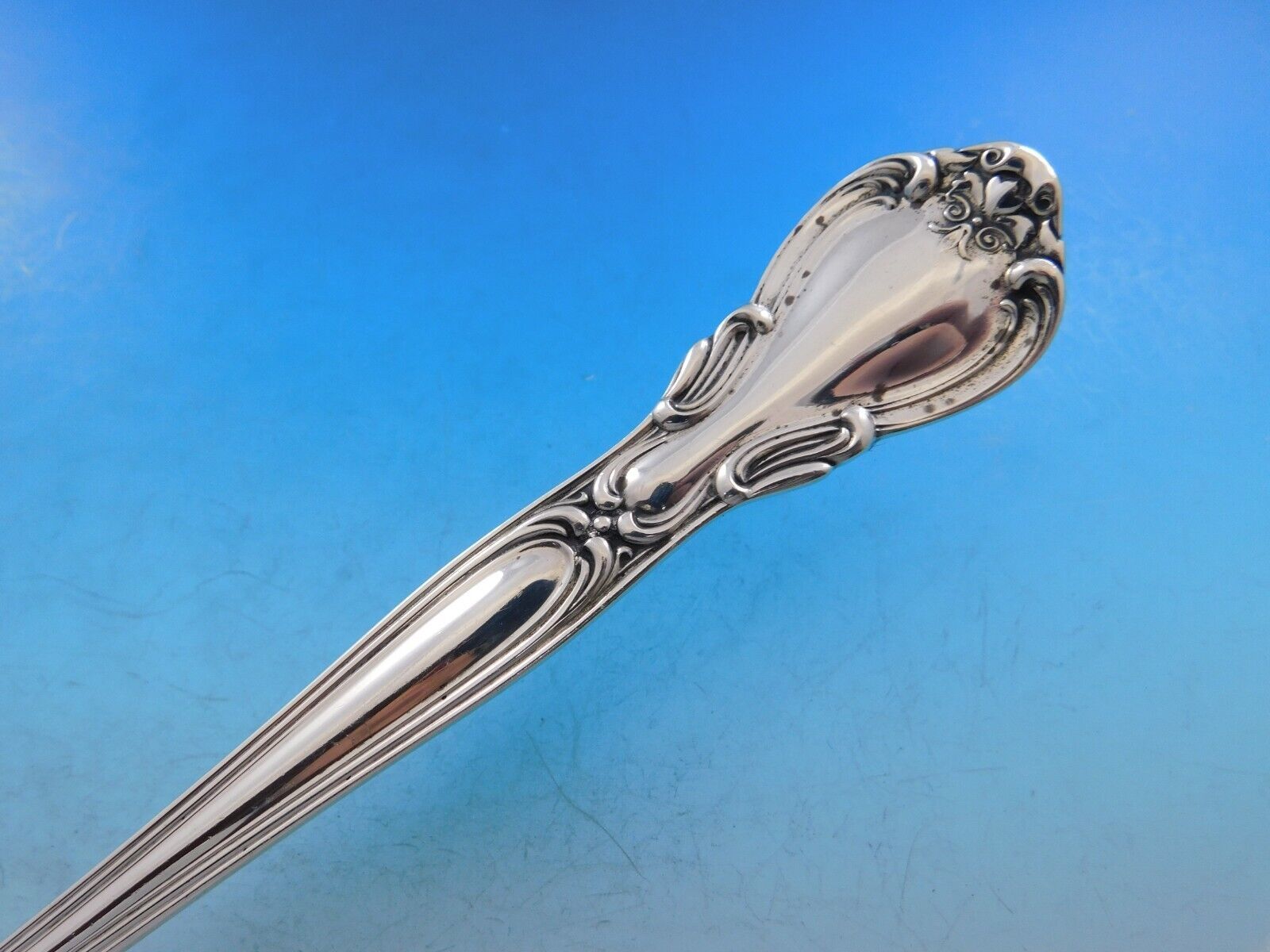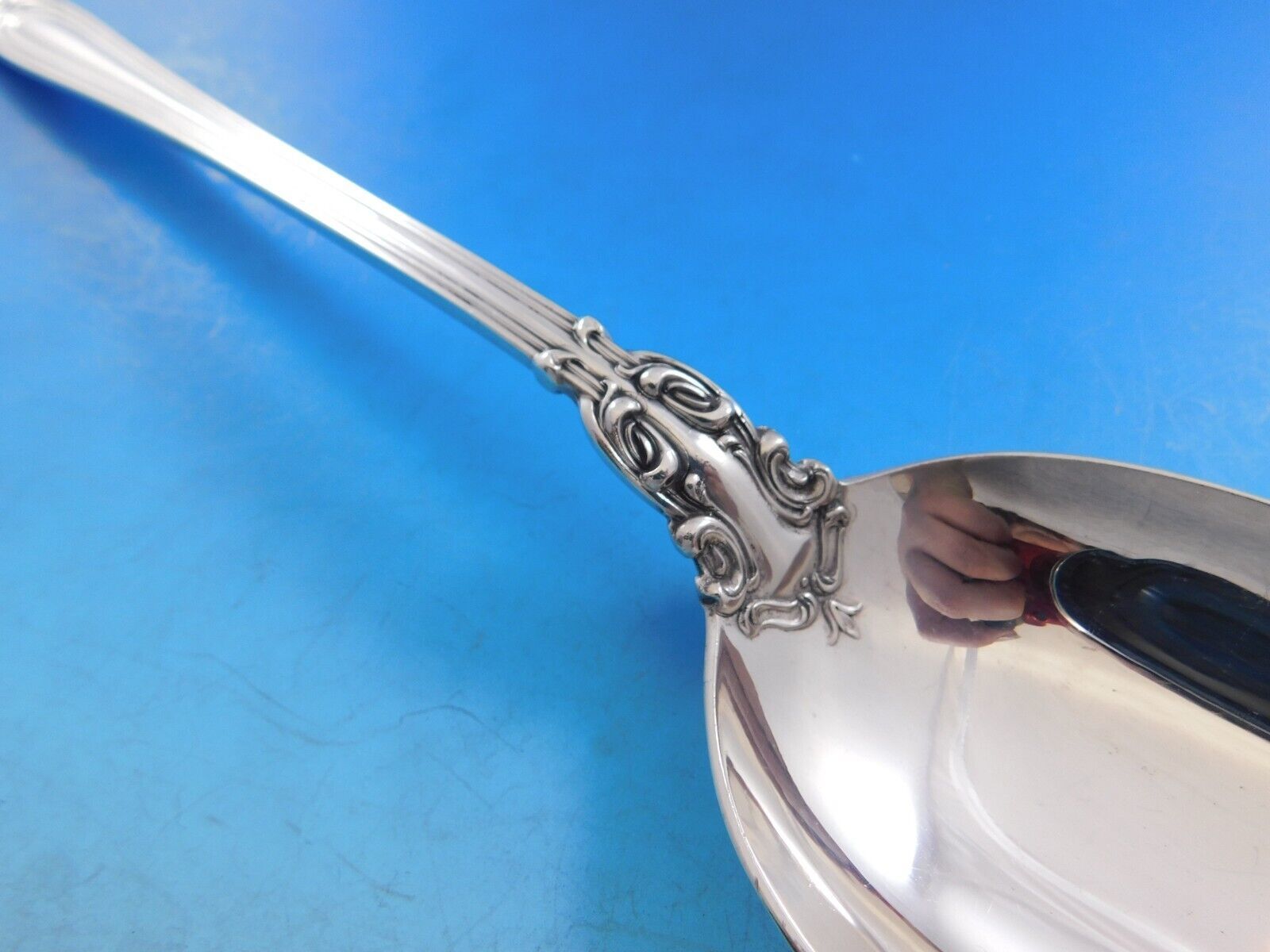 Sterling silver Platter Spoon 12 1/2" in the pattern Chantilly by Gorham. It is not monogrammed and is in excellent condition.
