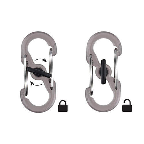 This mini s-biner features a center locking lever, stainless steel wire gates, and a tough polycarbonate body. These colourful tools are the perfect size for holding, organizing, and identifying keys or other small items. The simple twist-to-lock lever keeps items steadfastly in place, making this s-biner as versatile and convenient as it is secure.
