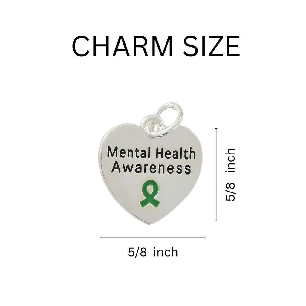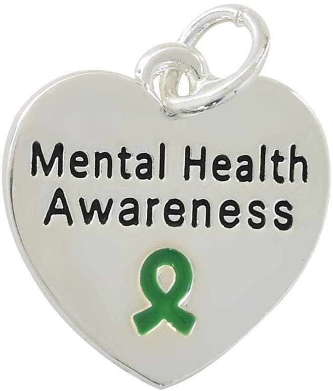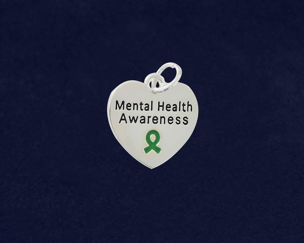 Silver heart charm with a green ribbon and the words "Mental Health Awareness"