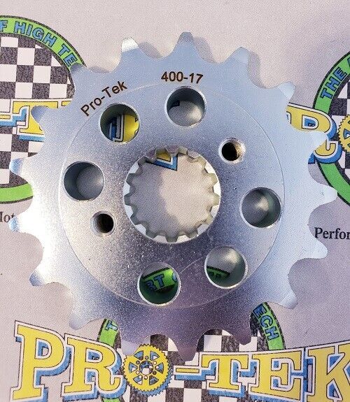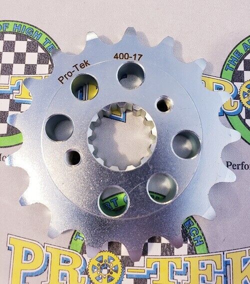 Pro-tek front sprockets are also completely CNC machined to exact tolerances from 4140 nickel-chromoly steel resulting in a quality product. None of the Pro-tek front sprockets are gear hobbed, but are lightened with drilled holes to save on rotating mass. Every lb of rotating mass equates to a 4 lb weight reduction. The sprockets are then case hardened to Rc 58-60 and finished with a zinc plating for added durability and protection from corrosion. Made in the USA, normally retail for $29.95. This is for a 520 Pitch front sprocket 15, 16 or 17 tooth.