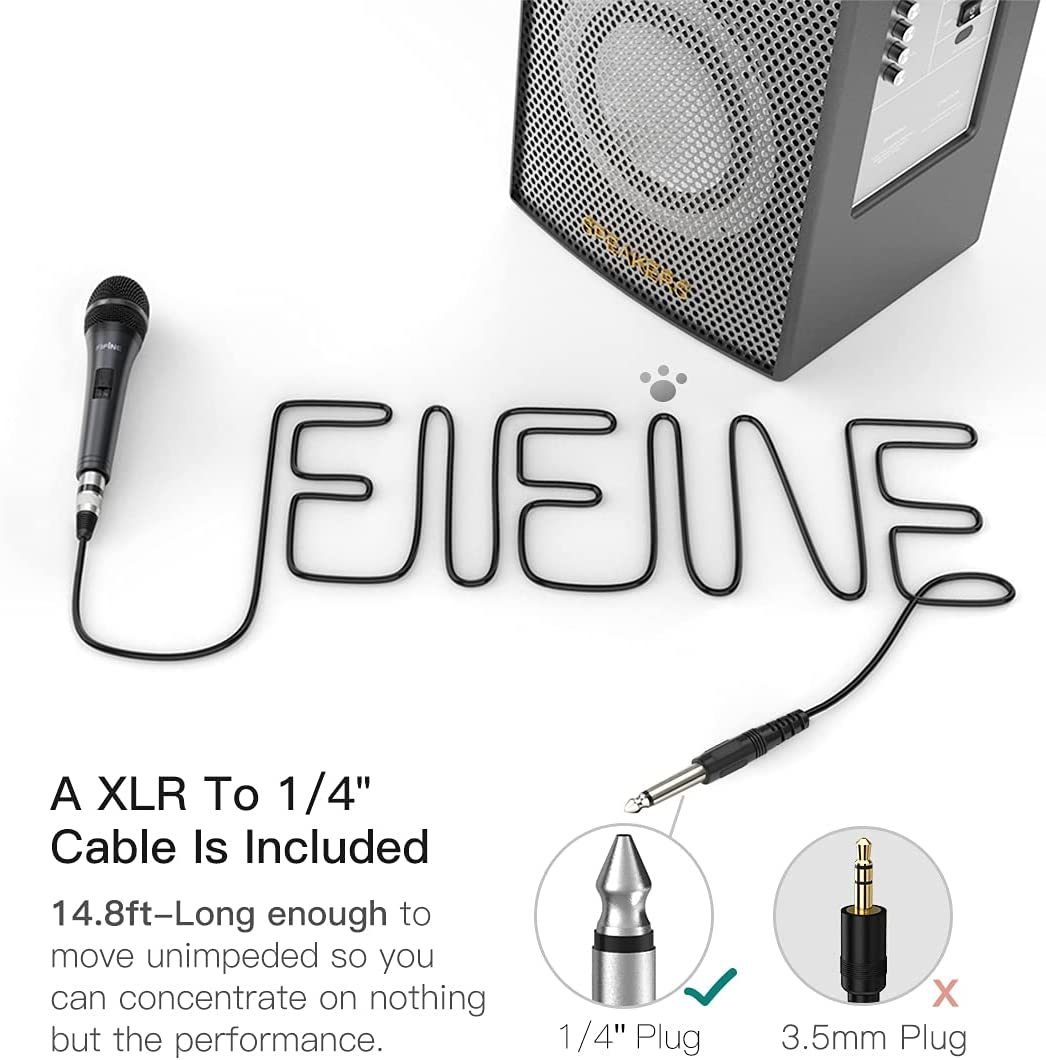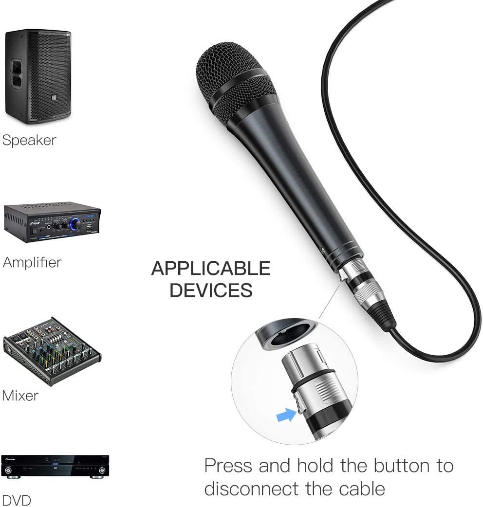 ?CARDIOID DYNAMIC Karaoke MICROPHONE-Wired microphone with cord for karaoke features a cardioid pickup pattern for greater gain while simultaneously minimizing feedback. The plug in microphone, music stuff, is ideal for live situations where noise cancellation is needed, which makes the handheld DJ microphone corded remarkable for presentation, wedding, conference, church, interview and solo performances stage. ? FLAT, WIDE-RANGE FREQUENCY-The smooth frequency range is solid at 50 to 18 kHz. The 1/4?? microphone karaoke is suited well for handling high sound pressure levels. 1/4'' plug in microphone is tailored for spoken word, various instruments like acoustic guitar. Having no power requirement makes dynamic microphone for singing the ideal choice for any live applications. ? OPTIMAL SPEECH INTELLIGIBILITY-Such karaoke microphone system for adults, the vocal microphone wired delivers an low distortion for clean sound output, precise reproduction of speech and vocals with excellent intelligibility. The dynamic vocal microphone with cable is suitable for recreational activities, such as singing, karaoke, home party and performance, indoors or outdoors. ?A XLR TO 1/4? CABLE INCLUDED-Allowing the wired microphone for karaoke to be directly plug in amplifier speaker or karaoke machine that has 1/4inch (6.35mm) mic in jack. The dynamic vocal microphone protected by two-tire PVC, and it?s thick enough for brilliant, transparent sound transmission with no loss. The corded microphone with 14.8ft-long enough cable can be moved unimpeded so you can concentrate on nothing but the performance. ? RUGGED AND RELIABLE METAL CONSTRUCTION-The karaoke microphone set for singing that is robust, simpler to operate with suitable size and shape for your hands, being a better option for public speaking. Built-in pop filter for protection against plosives. An external on/off switch on it for easy control of audio.