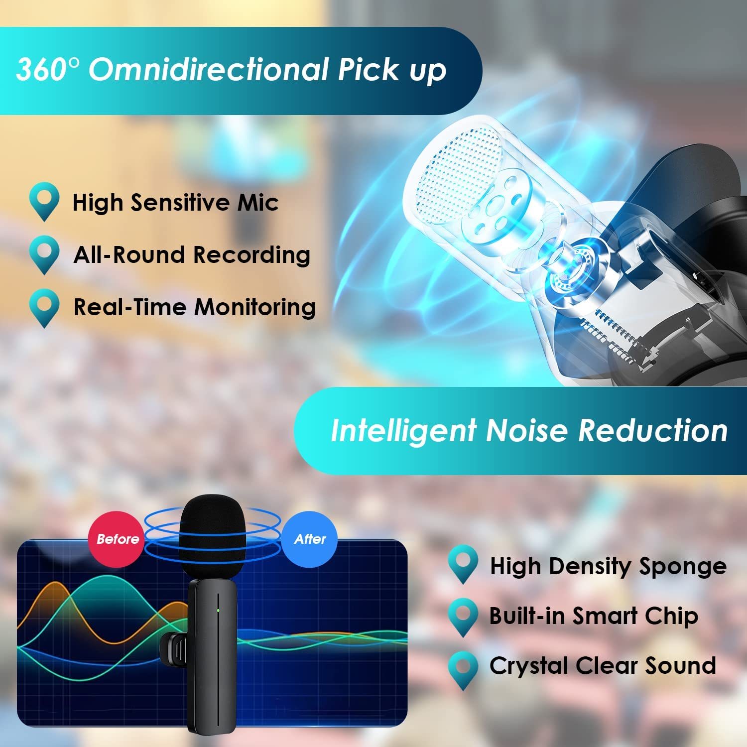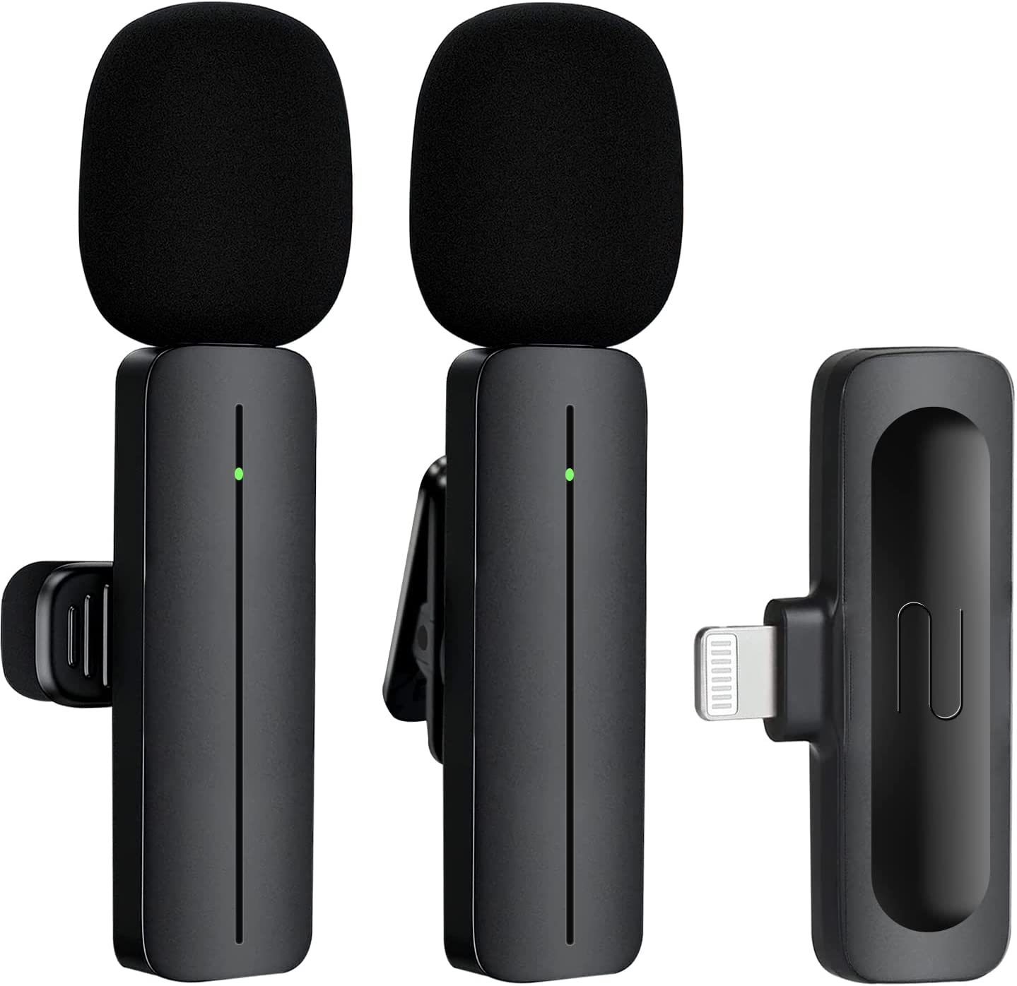 1 Receiver with 2 Transmitters: This mini wireless lavalier microphone kit has 1 receiver and 2 transmitters included, which makes it possible to record sound or video from both 2 parties at the same time. Also, you can use just use 1 mic alone for interviewing, vlogging,live streaming, podcasting or online meeting Easy Connection, Plug Play: The smart clip-on microphone is much easier to use than other microphones. Just plug the receiver into your devices and turn on the power switch of the transmitters, the two parts will get connected successfully and auto paired immediately. Then you can start to record voice or videos without opening extra app or bluetooth in your cellphone Smart Wireless System Hands-Free: The cordless lav mic is inserted with bluetooth technology that allows you no longer to be restricted to the length of the wire while recording. You can just clip the microphone on your shirt to free your hand and recording at a remote distance. Without messy wire, it will be very convenient for you to record on different social media platforms like Youtube, Tiktok and etc. Omnidirectional Sound Noise Cancellation: This portable lapel mic is equipped with little spray-proof sponge foam and high sensitive microphone, which can pick up sounds from all directions and offer you clear recordings. Besides, with innovative noise reduction technology, noise is blocked from your surrounding environment to ensure you a quality sound and better experience Compatible with iOS Devices: The small upgraded lapel mic is compatible with iOS system and can be use with iPhone and iPad. Without usb c type interface connected to your mobile phone, it can not be used with android devices