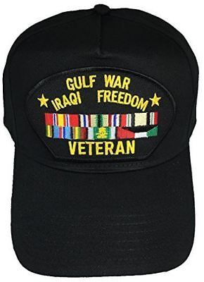 GULF WAR-IRAQI FREEDOM VETERAN WITH CAMPAIGN RIBBONS HAT - BLACK - Veteran Owned Business. Black Cap High Detail and Impact -GULF WAR-IRAQI FREEDOM VETERAN WITH CAMPAIGN RIBBONS HAT. 8 Rows Stitching on Visor and Pro Stitch on Crown 5 panel hat.GULF WAR-IRAQI FREEDOM WITH CAMPAIGN RIBBONS HAT - Adjustable Size, Black Golf Style. HatnPatch Is THE Veteran Owned and Operated Family Business - 2 Generations of Retired Marines - We Ship Your Order Within 24 Hours And Usually The SAME DAY!