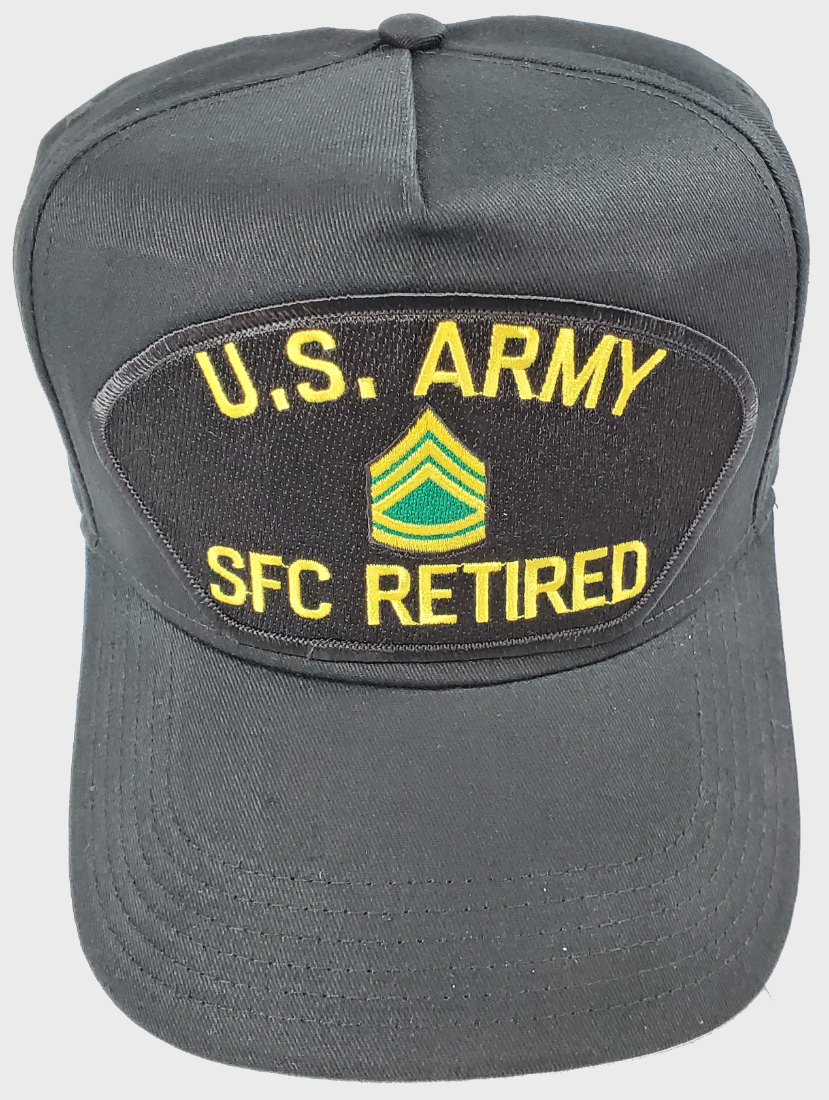 US ARMY SFC SERGEANT FIRST CLASS RETIRED E-7 RANK HAT CAP - Black Cotton Golf Style Hat Cap with New, Larger 6 inch wide x 3 inches tall PATCH adhered to hat with industrial-strength high-heat hat press - Hook and Loop Closure on back of hat, Adjustable Size. One Size Fits Most. Great gift idea for any soldier who proudly retired as a SFC. Veteran Owned and Operated Business - 2 generations of retired Marines.