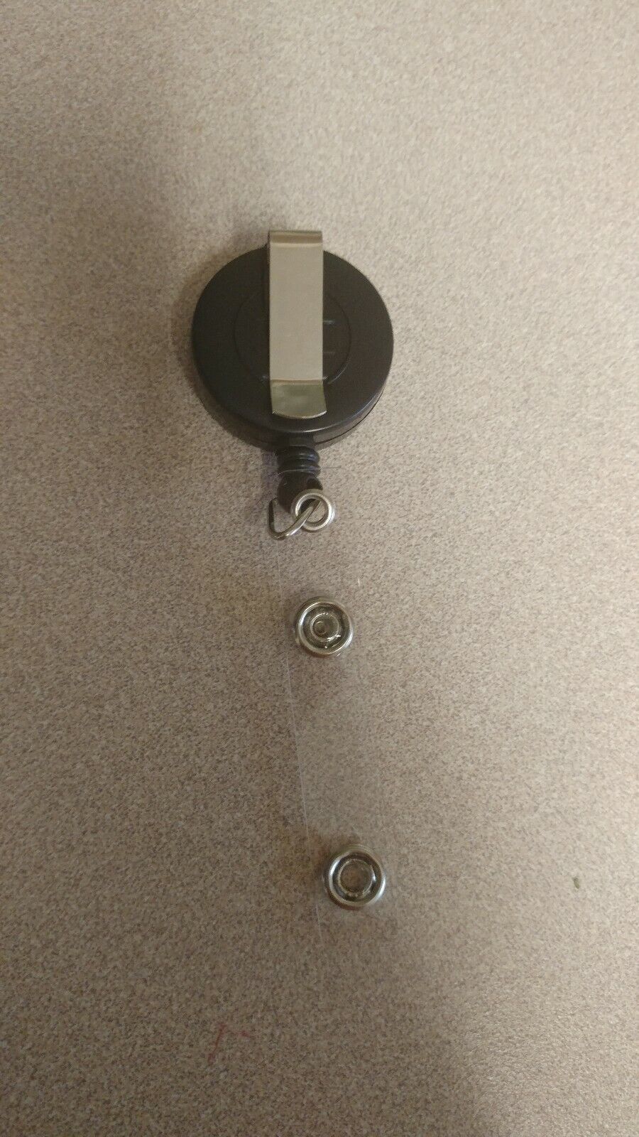 THis IS VERY CUTE BLACK AND SILVER RETRACTABLE BADGE VERY WELL MADE VERY DURABLE ?..1.5 inch round....I have the alligator swivel clip available also but only upon request via message