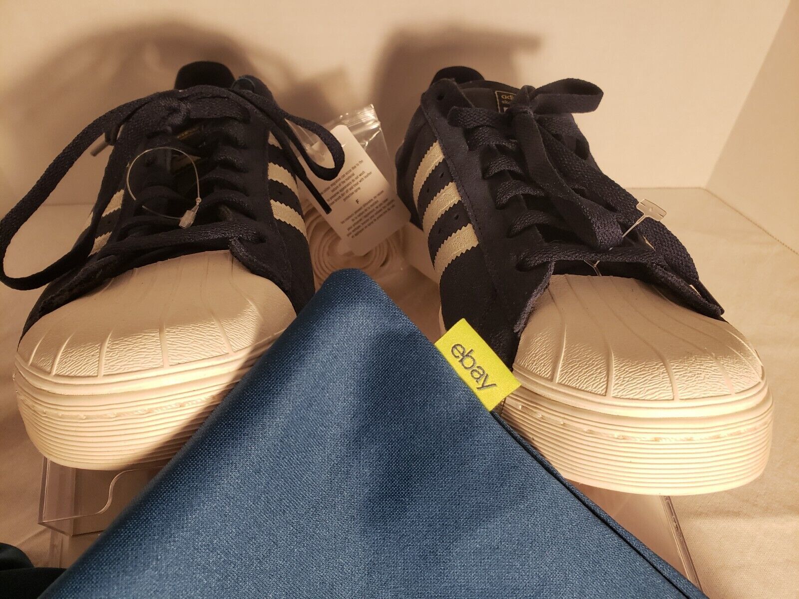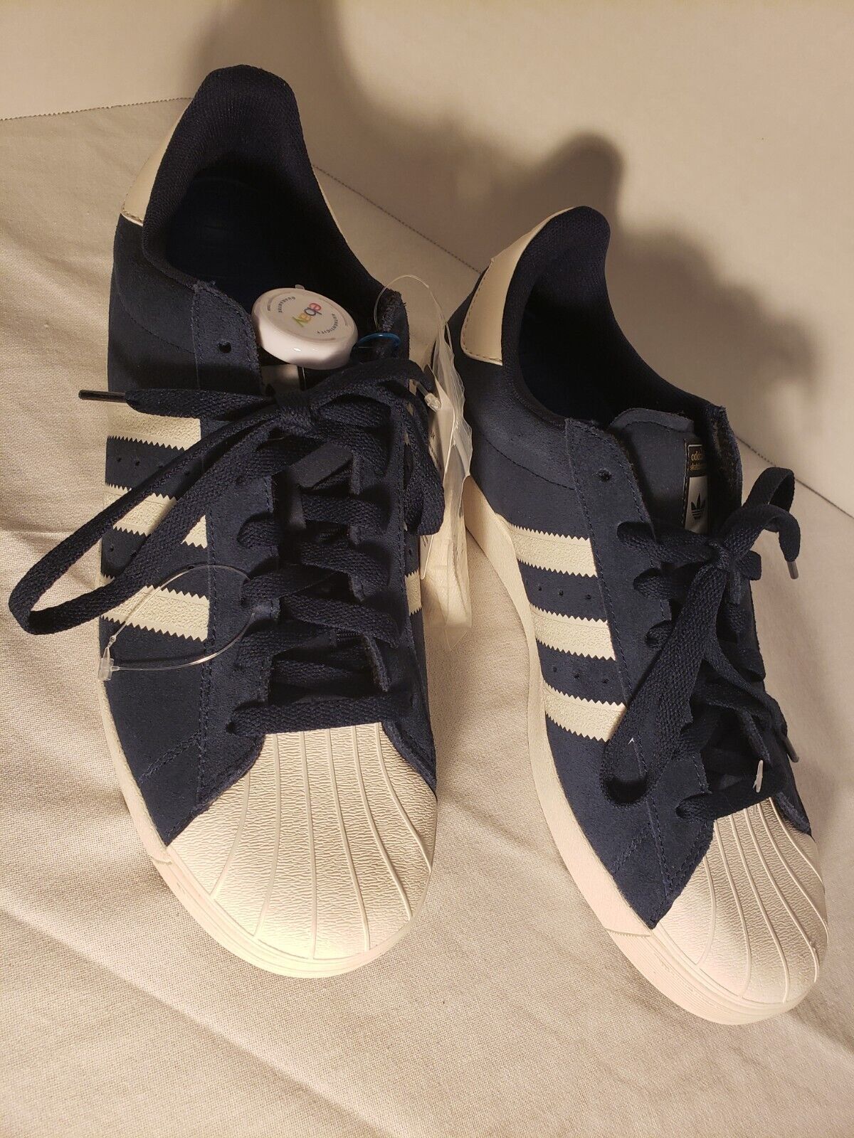 ADIDAS SUPERSTAR VULC SHELL TOE SHOES - MENS 10.5 BLUE/WHITE/GOLD PRINT/GUM SOLE