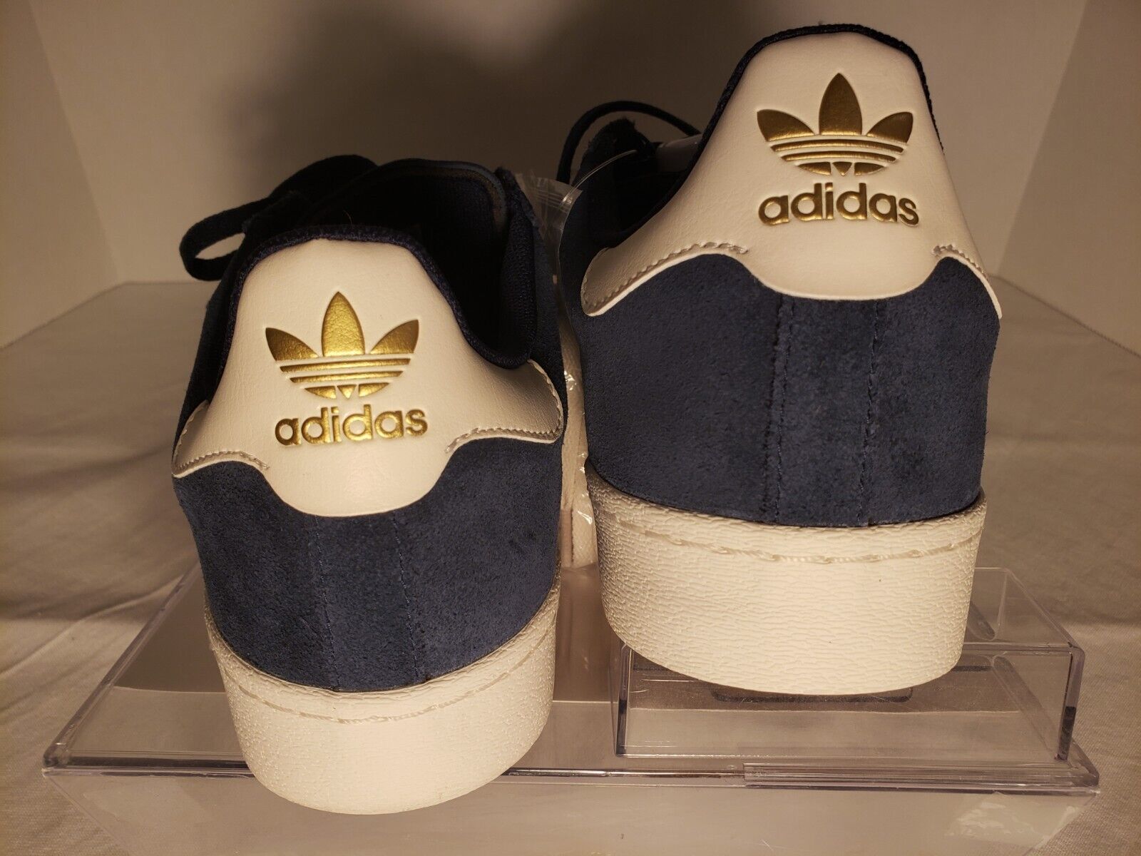 Blue suede upper, with white toe and stripes, gold trim/writing/logo, proper gum rubber sole. The PERFECT COLOR COMBINATION!