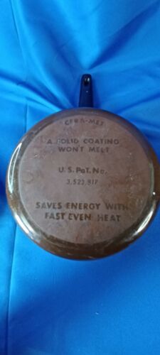 This vintage Cera-Met saucepan with lid is a unique addition to any collection. The brown enamelware features a design of vegetables, mushrooms, onions, and leaves, making it a great decorative piece. It is compatible with induction, electric, and gas stoves, and was made with ceramic surface coating. This original round saucepan is perfect for sauteing and comes from a trusted brand.