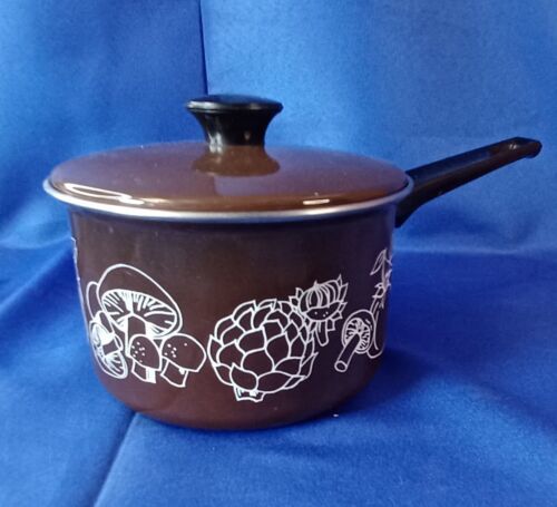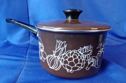 Vintage Cera-Met Brown W/ Vegetable Mushroom Onion Leaves Design- Saucepan w/Lid