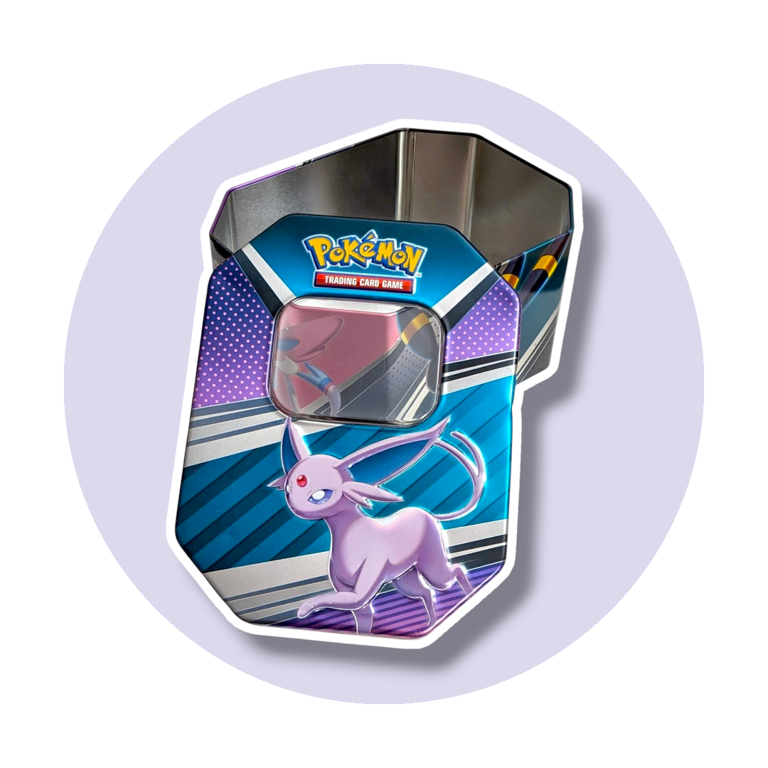 • A Pokemon themed storage tin featuring Espeon, Umbreon, and Sylveon