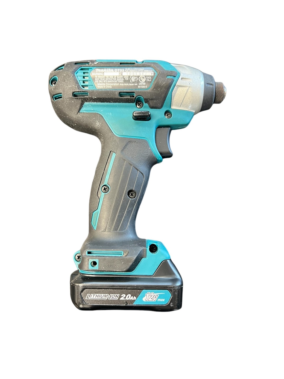 Category: Cordless hand toolsType: Impact DriverBrand: MakitaModel number: DT03Model name: Impact DriverSize: 10.8vColor: BluePower source: BatteryBattery Included: yesCase included: yesCharger Included: yesCondition:Used