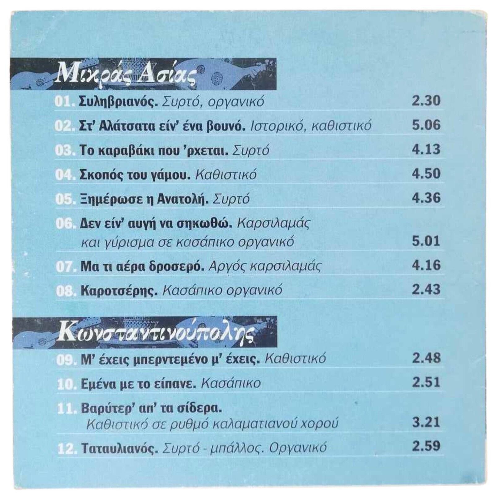 Embark on a musical journey through the rich culture of Greece with this captivating CD featuring Greek Folk Songs from Asia Minor and Constantinople!