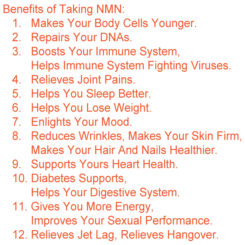 Harvard Medical School's research found that NMN could be a good approach of anti-aging which human race has searched for centuries. NMN can improve eyesight, hearing and revitalize muscle. It also expands life span. You can find these information on the official website of Harvard Medical School by searching the article "Rewinding The Clock" published by Ekaterina Pesheva on March 22, 2018.
