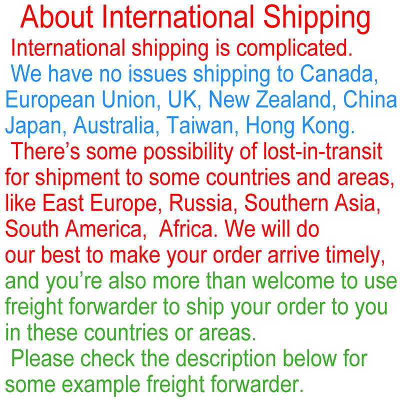 There?s some possibility of lost-in-transit for shipment to some countries and areas, like East Europe, Russia, Southern Asia, South America, Africa. We will do our best to make your order arrive timely, and you?re also more than welcome to use freight forwarder to ship your order to you in these countries or areas.