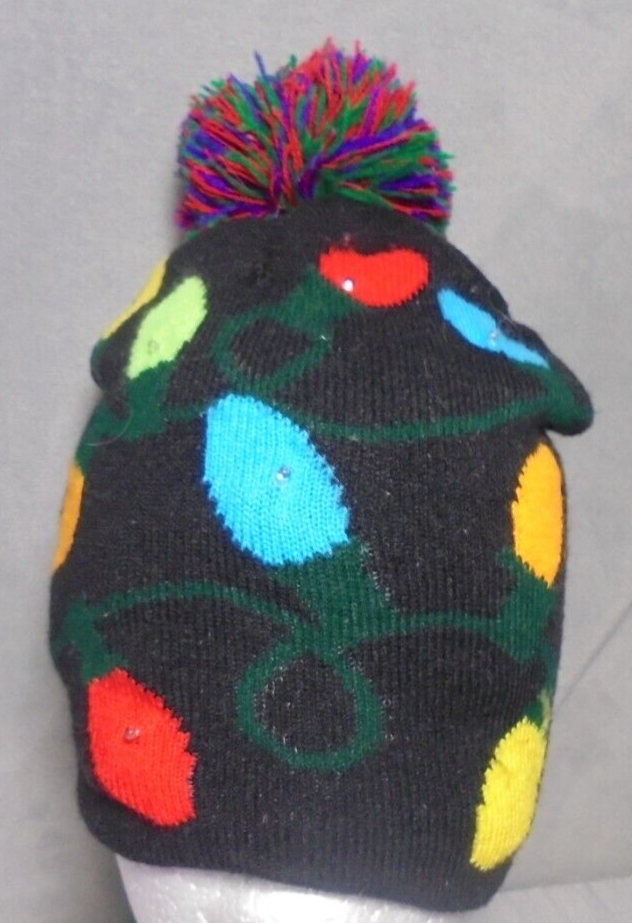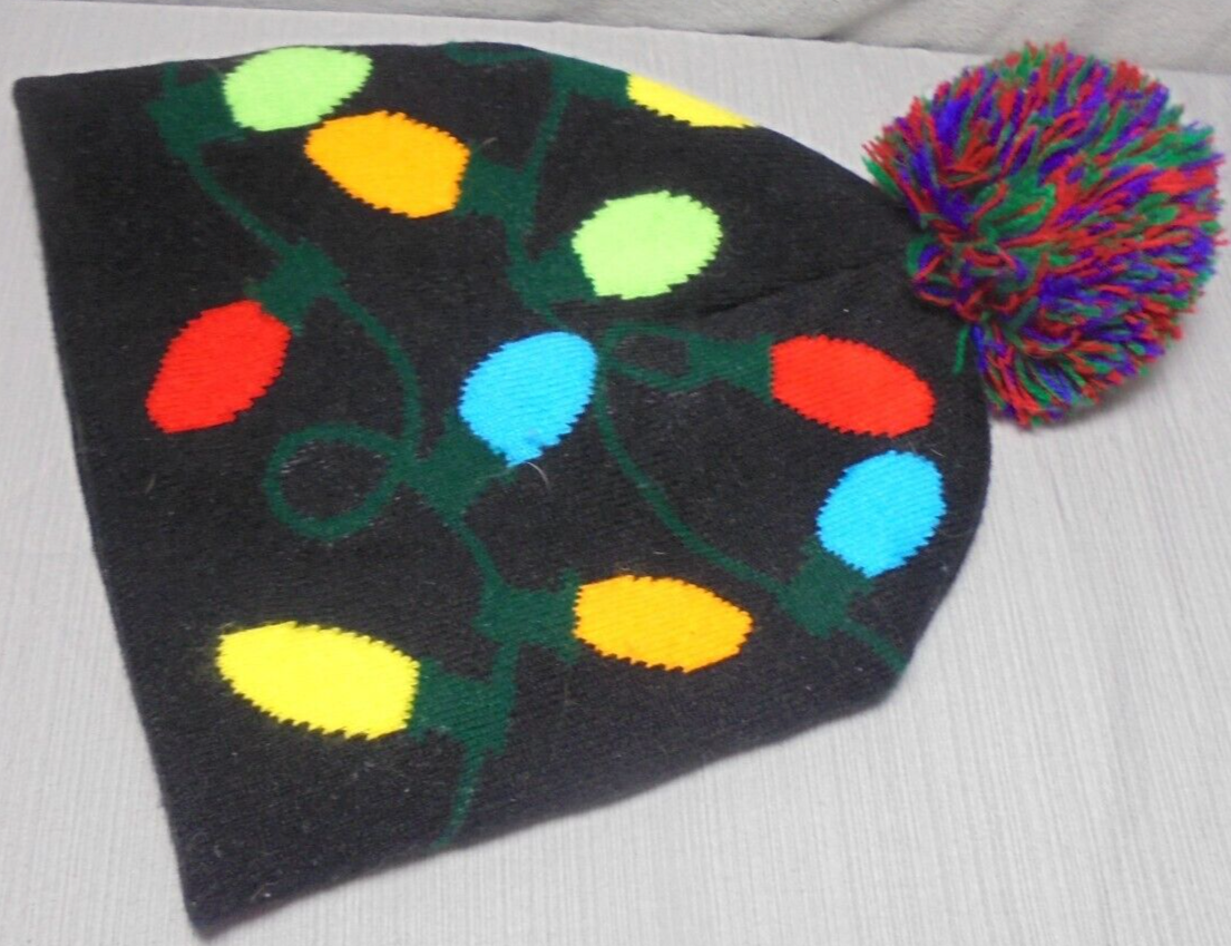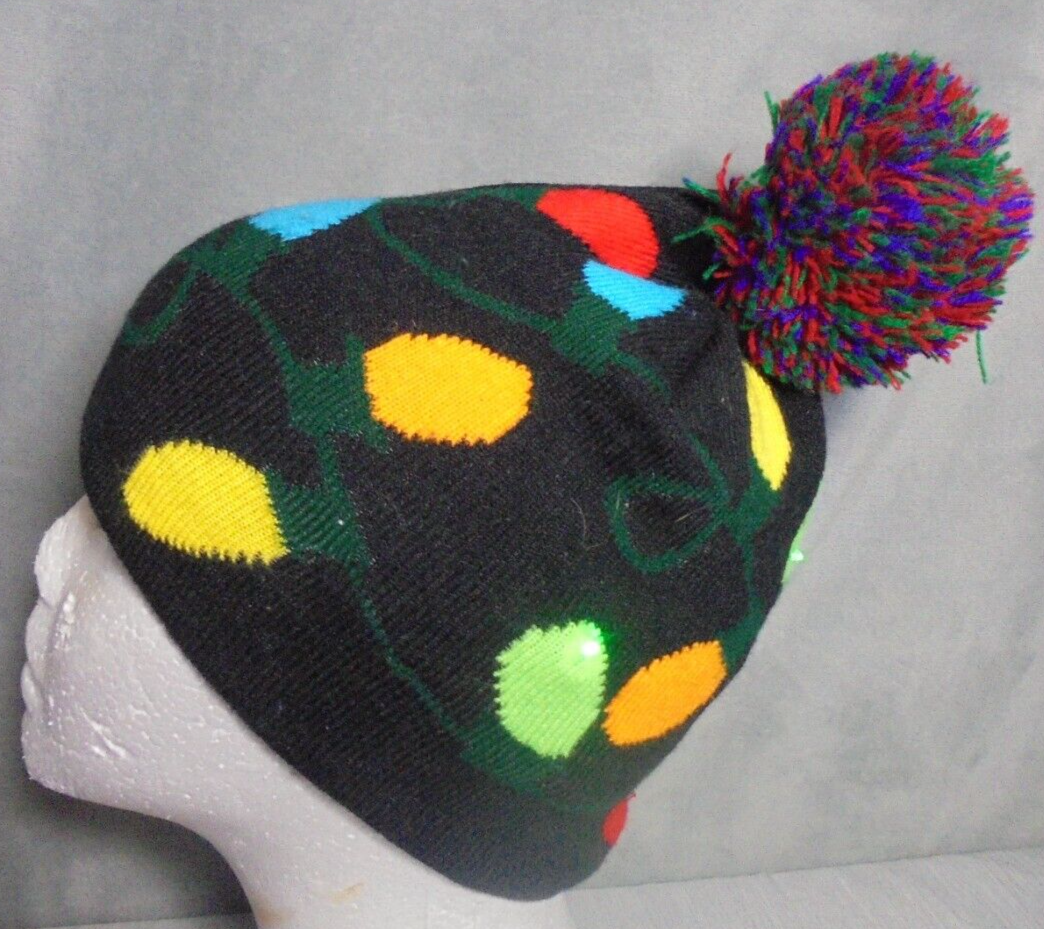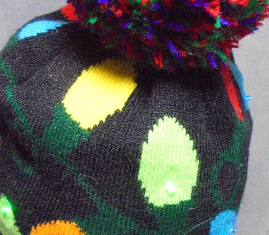 Christmas Lights Light Up Beanie Winter Cap Womens Black Colorful Pom Pom