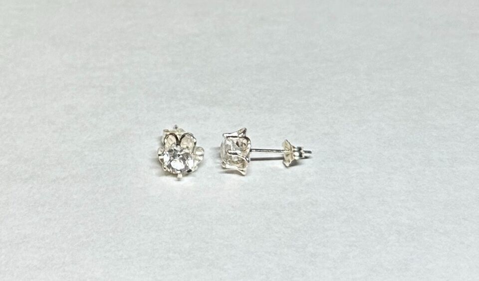 Prong-set synthetic white sapphires measure 5mm each (weighs 1.50 carats total weight)