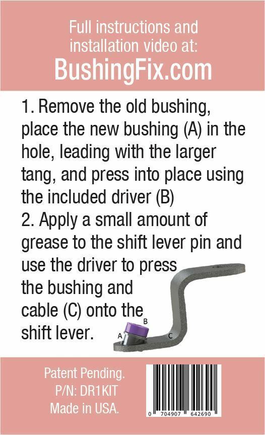 The kit includes DIY instructions, 2 custom molded bushings, grease, and patented installation tools. Bushing Fix DR1KIT?- Transmission Shift Cable Bushing Repair Kit ?; (US Patent # 10,215,273 and US Patent # 10,619,723).