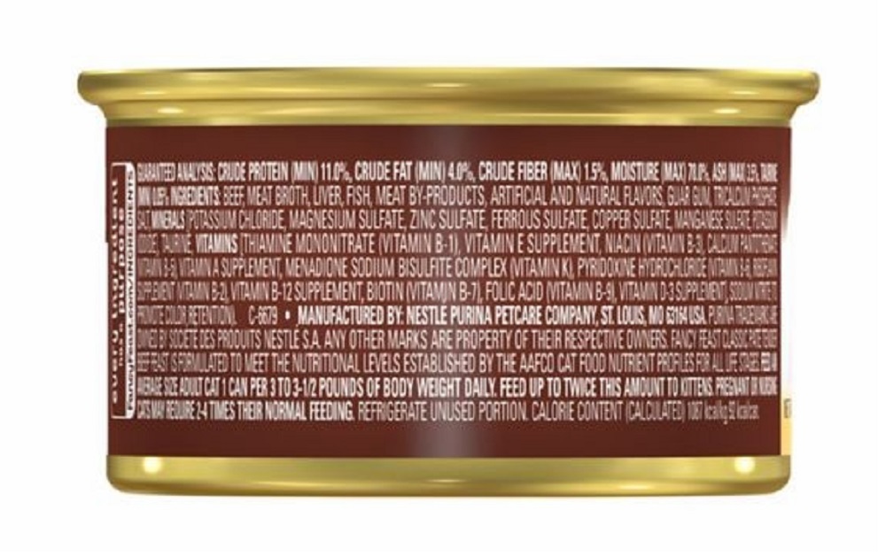 Wet cat food has 100% complete and balanced nutrition Essential vitamins and minerals help support her health Cat food made from grain-free formula Includes high-quality beef for a delicious flavor Pate recipe of cat food provides tender texture cats love Gourmet recipe creates flavor-filled experience Grain-free wet cat food comes packaged in easy-to-open, recyclable cans