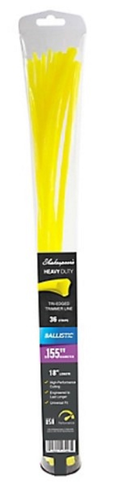 Shakespeare Ballistic .155 in. diameter tri-edged trimmer line 18 in. pre-cut strips are designed for heavy-duty use. Ballistic is engineered to be one of the longest-lasting and most durable lines on the market. Ballistic line is proudly made in the USA under tight quality controls.155 in. diameter is designed to fit most walk-behind gas trimmers. Includes 36 pre-measured and pre-cut 18 in. long strips.