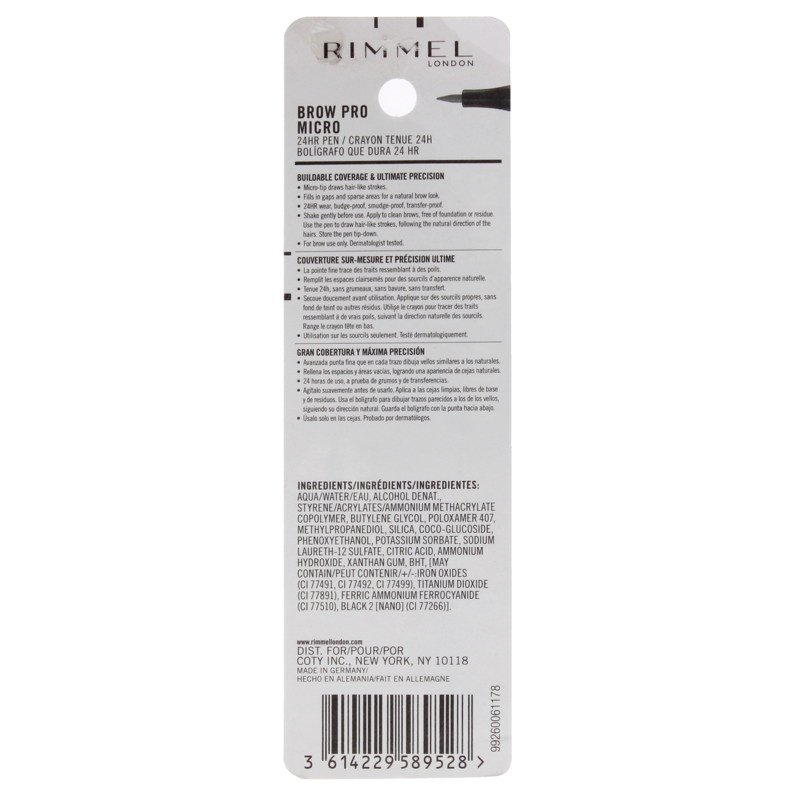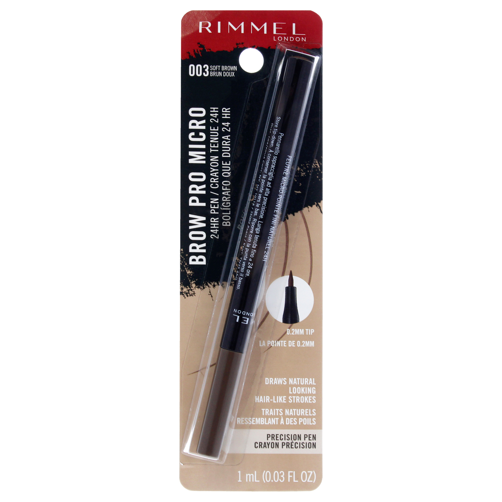 Brow Pro Micro 24HR Pen in shade 003 Soft Brown by Rimmel London is a 0.03 oz pen designed to fill and define eyebrows with precise, hair-like strokes. This long-lasting formula provides a natural, microbladed effect that lasts up to 24 hours. Its ultra-fine tip allows for easy application, creating a flawless brow look that is both defined and natural, making it perfect for daily wear.
