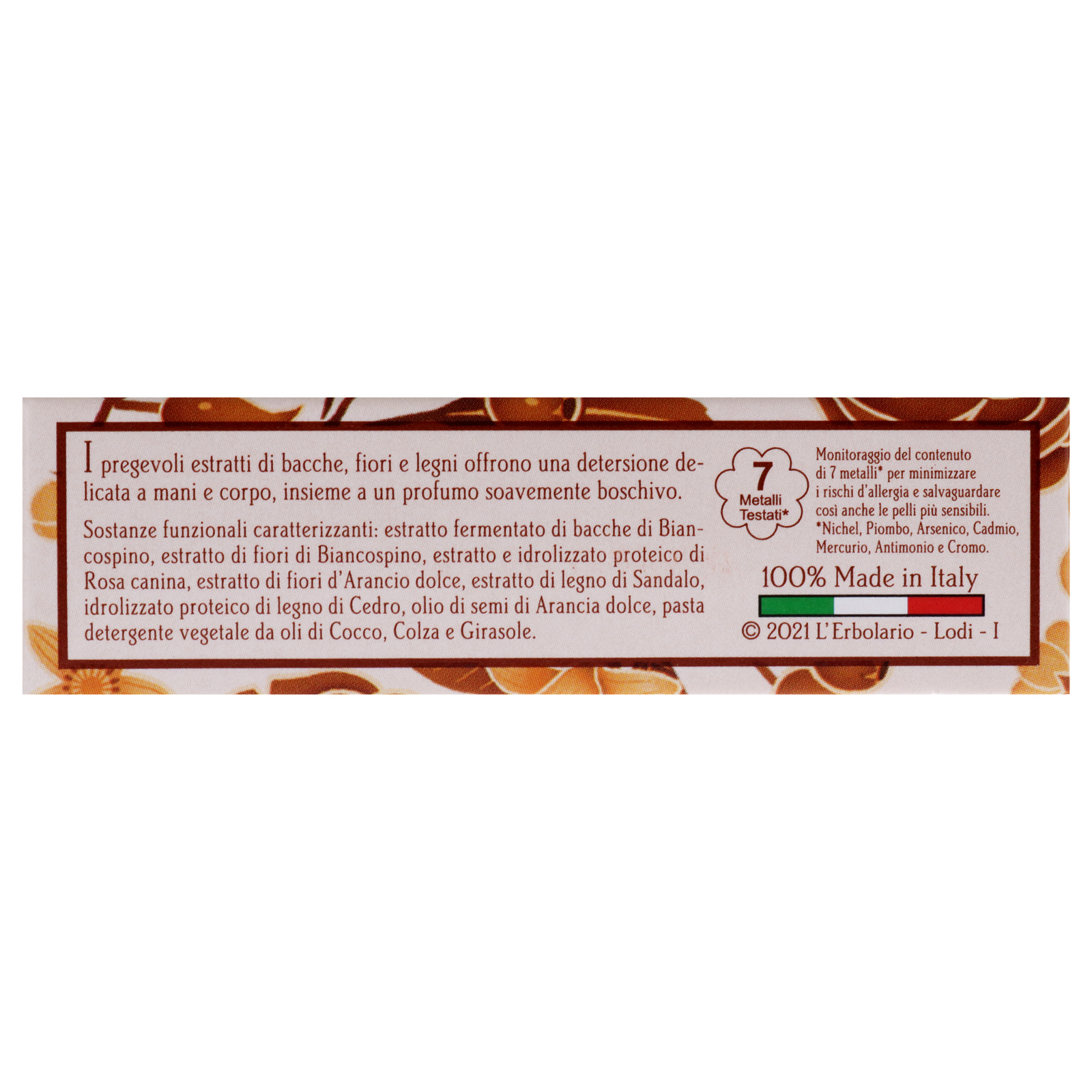 The fine extracts of berries, flowers and wood varieties offer gentle cleansing for hands and body, combined with a delicate woodsy perfume. It gently removes dead cells and helps make the skin supple. Suggested use : between moistened hands, let it form a sweetly scented pleasant foam which will take care of even the most sensitive skin.