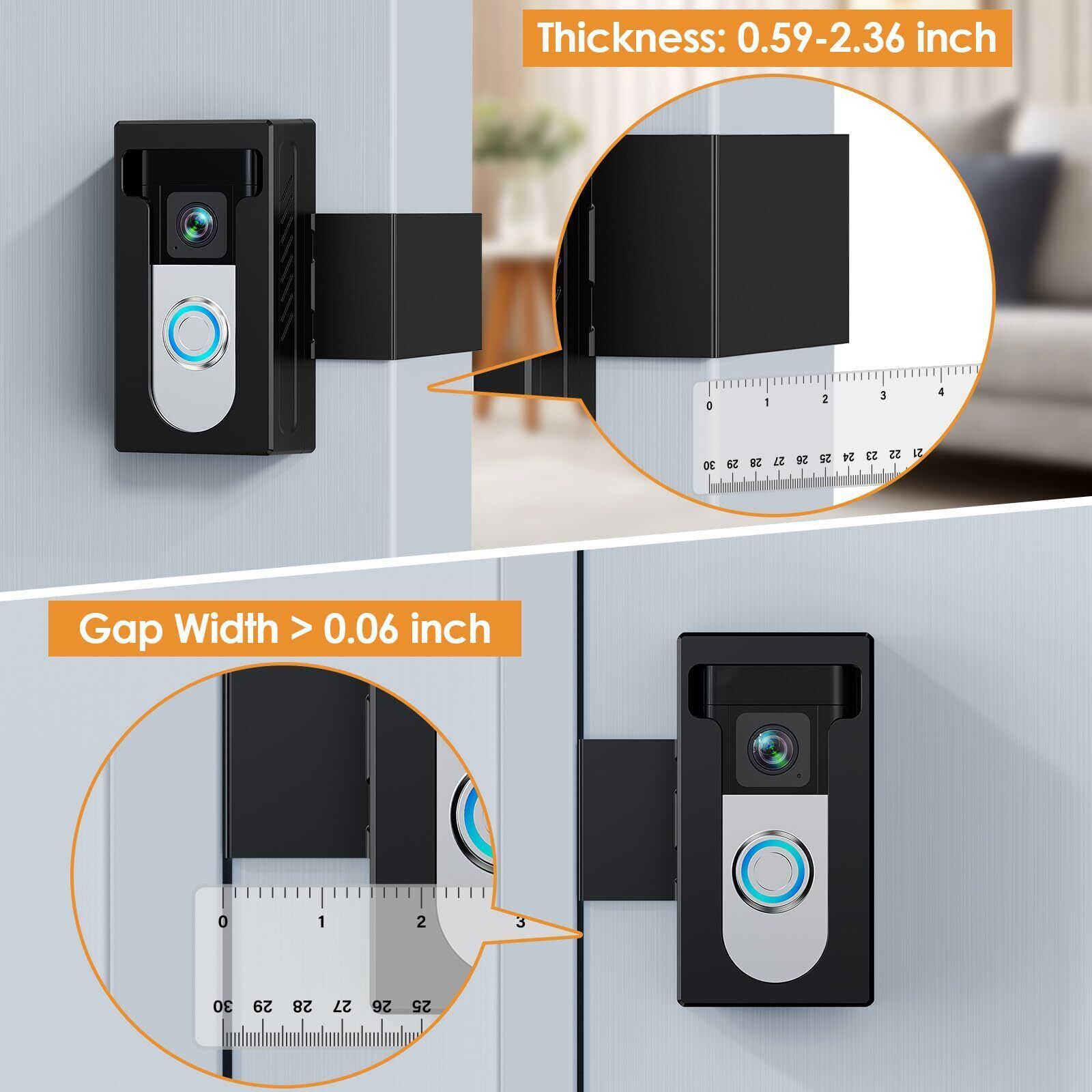Versatile Fit: Designed for doors 1.18" to 2.20" thick with a minimum gap of 0.06". Not suitable for storm, screen, or iron security doors. The doorbell camera mount works great for left or right- inward opened doors.