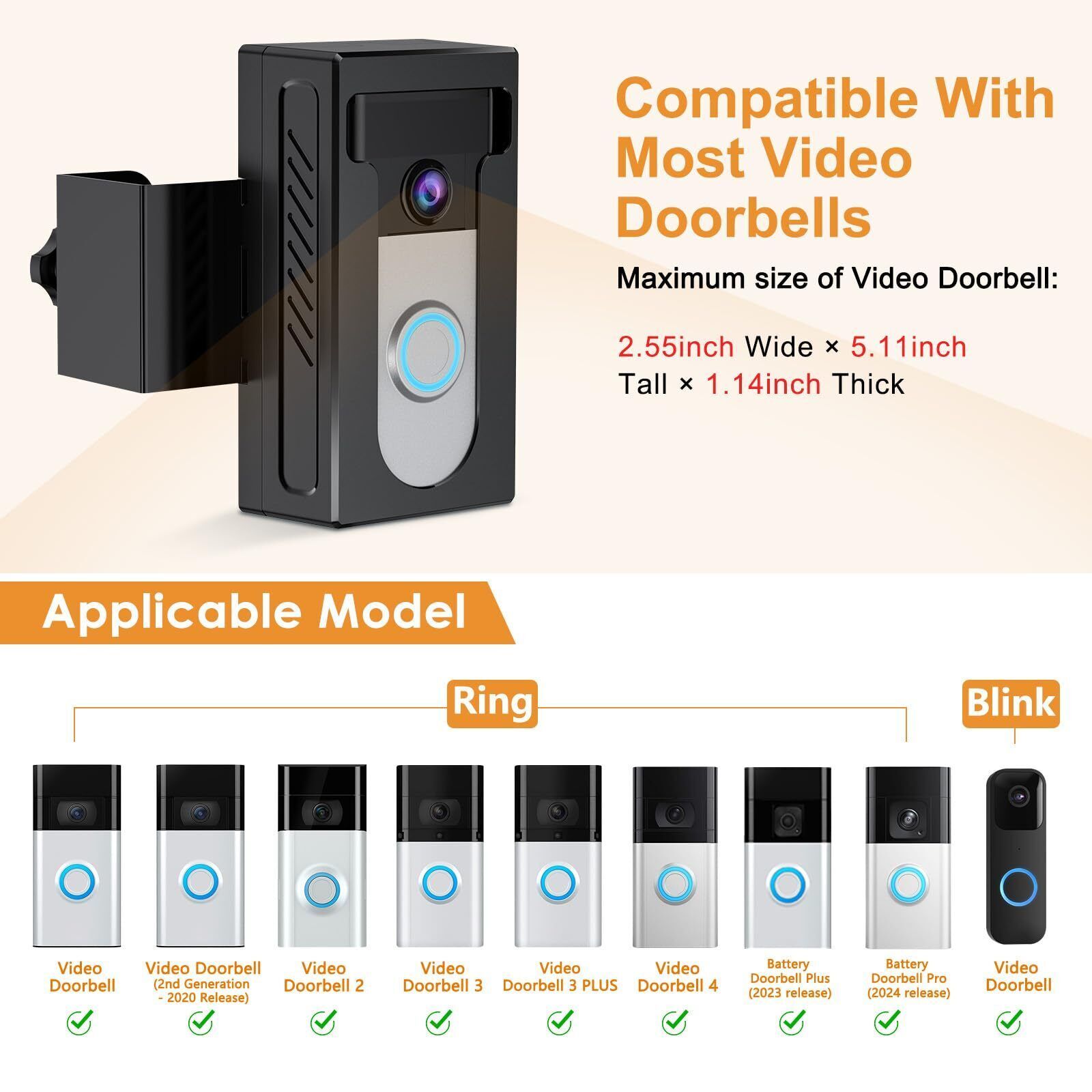 Compatible Models: Fits Ring/Blink Wireless Video Doorbell / Video Doorbell 2 / Video Doorbell 3 / Video Doorbell 3 Plus / Video Doorbell 4 / Video Doorbell (2020/2023/2024 Release). (Doorbell Not Included).