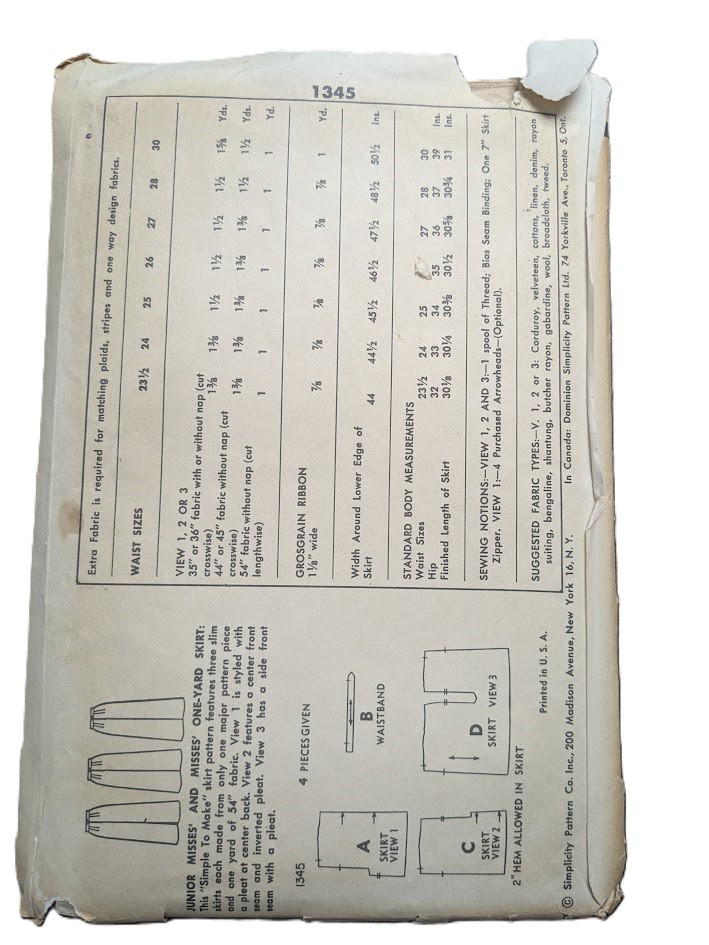 30 in VINTAGE 1950s SEWING PATTERN Simplicity 1345 1 YD Skirt