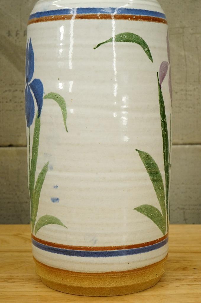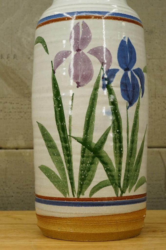 Studio Artisan Pottery Purple Blue Iris Flowers Tall Ribbed Vase 12.5" Tall