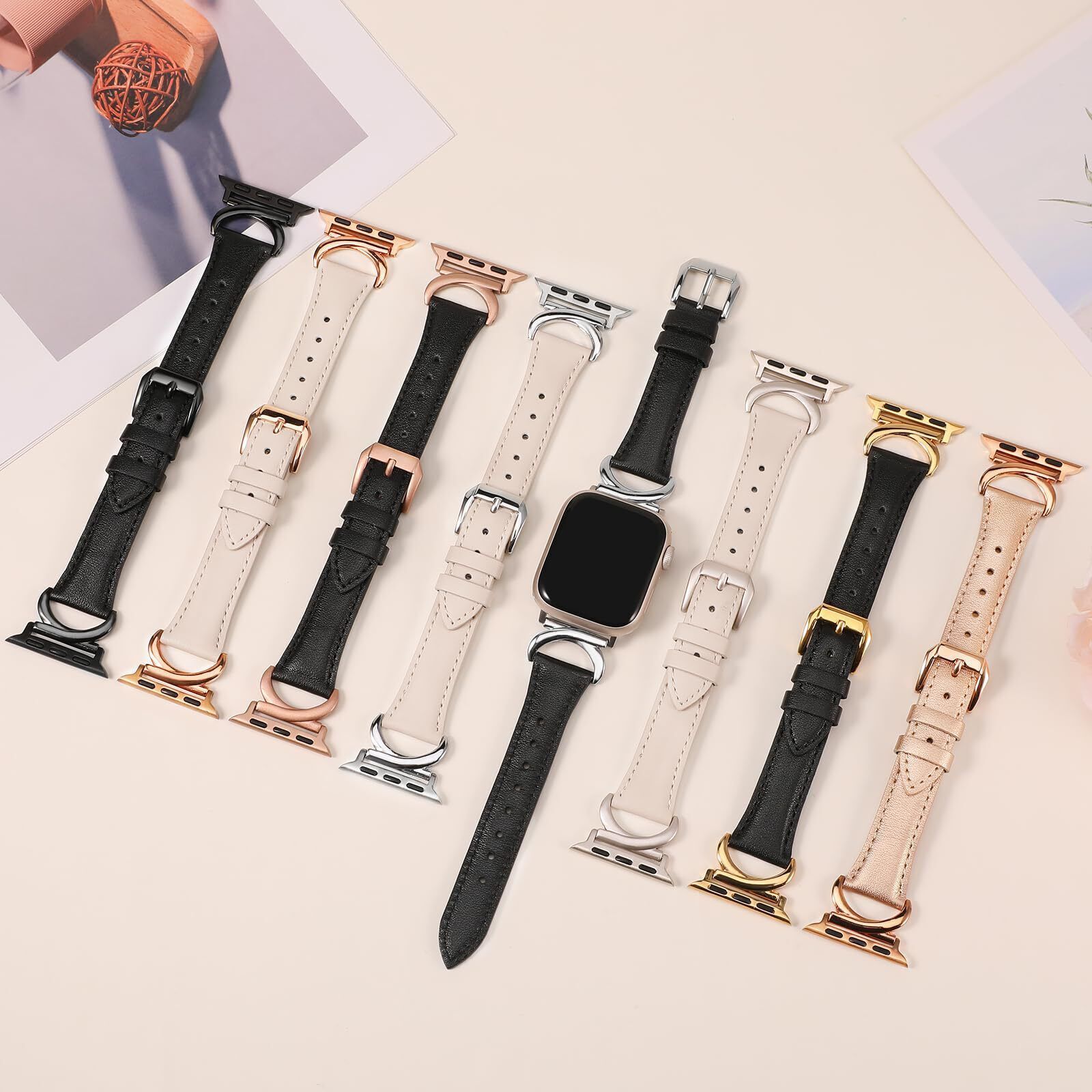 Color: Starlight/StarlightFeatures: Personalized Design: Minyee slim leather band compatible with apple watch features a chic C-shaped metal buckle design, the classy band with a sophisticated and professional look adds an extra touch of sophistication to casual or dressy occasions Premium Leather Material: Made with soft and durable leather material, soft texture and good hand feeling. This makes this leather band feel extremely comfortable to wear, casual and durable; offers a new watch accessories bracelet to your life Compatible Models: The dressy leather watch bands compatible with Apple Watch Ultra 1/2(49mm), Series 10 (42mm 46mm), Series 9/8/7(41mm/45mm), Series SE/6/5/4(40mm/44mm), Series 3/2/1(38mm/42mm). One size fit for the wrist of 5.1" -7.6" inch (130mm-193mm) Secure Metal Connectors: The fashion leather watch band for women comes with stainless steel connectors at both ends to lock the watch firmly on the wrist and prevent it from falling off and scratching. Different color connectors and clasps can also better match your watch and bring a more unique style Great Gift Choice: The Minyee designer leather apple watch band is a great gift for yourself or your families, friends. It's simple and chic design will bring you and your friends a ton of compliments, the best gift to give on Women's Day, Mother's Day, Thanksgiving, Valentine's Day, Christmas, New Year Package Dimensions: 6.0 x 4.2 x 0.3 inches