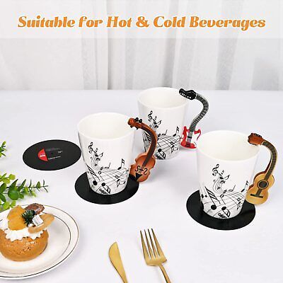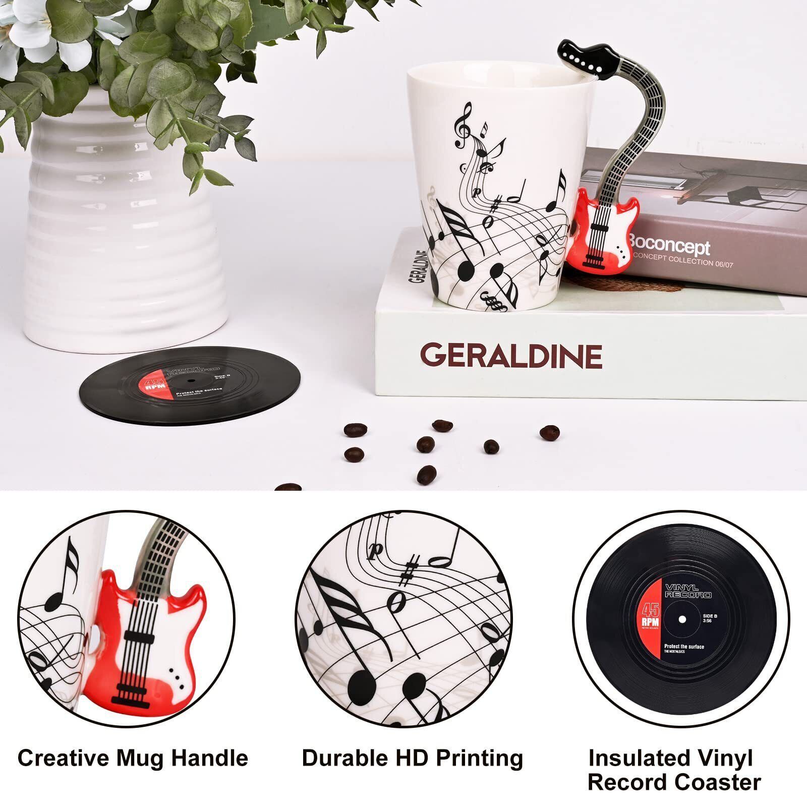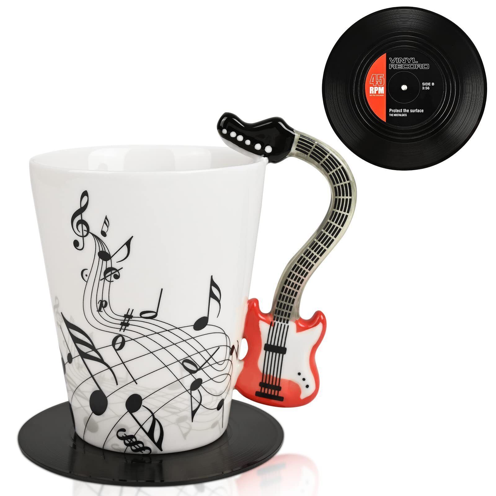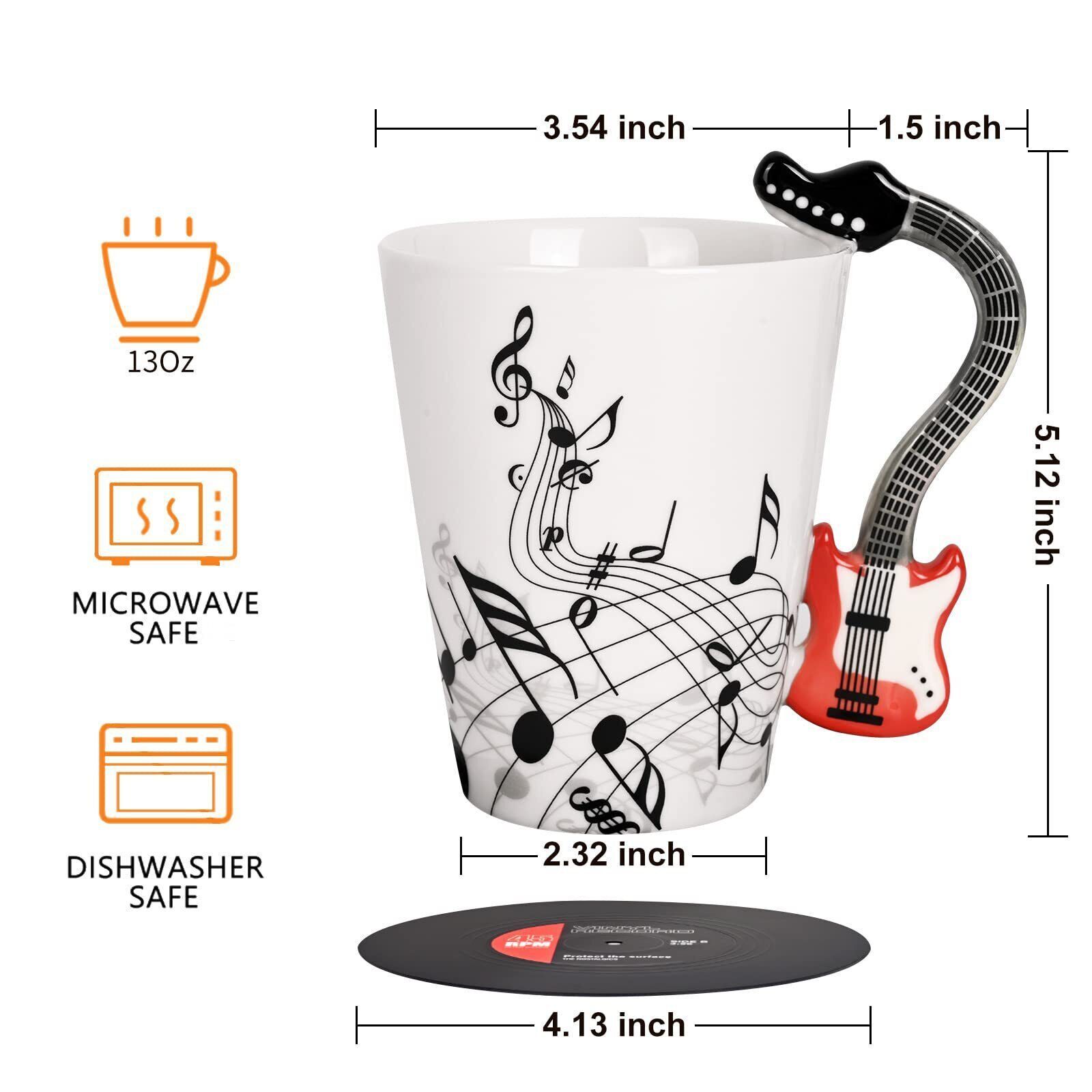 Color: Red GuitarFeatures: EXCELLENT GIFTS FOR MUSIC LOVERS: This well made super trendy guitar mug will be a perfect music gift for guitar players, guitarists, guitar enthusiasts, music lovers, musicians, music teachers to drive them crazy and help them stimulate musical inspiration. You can give this awesome gift away to them on their birthday, Christmas, Teachers Day, Mothers Day, Fathers Day. They will absolutely love it. CREATIVE COFFEE MUG DESIGN: The cool designs of the red electric guitar mug handle and the beating notes on the mug will make your music-loving friends adore the unique mug. The handle of the cup is quite whimsical and funny to look at and also easy to grip. The beating music notes also remind of us the pulsing of sound waves. The funny music mug also comes with a creative plastic vinyl record coaster which makes better insulation. REASONABLE COFFEE CUP CAPACITY: The music gifts for men hold a generous capacity of 13 Oz of both hot and cold beverages such as coffee, hot tea, hot chocolate, ice beer, orange juice and etc. The well designed guitar cup will help you start your new day bringing you good mood in the morning. When you are off duty and come back home, a cup of tea with this super lovely mug will help you get rid of fatigue of the day. VERSATILE USAGE FOR VARIOUS OCCASIONS: The guitar gifts for guitar players are versatile and practical, which can be used in many occasions such as home, garden, office, musical party and music themed restaurants and bars. Not only for drinking purpose, it can be also served as home or office decoration, pen holder, small vase and etc. The guitar coffee mug is both inspirational and pragmatic gift to bring music lovers joy and inspiration. DECENT QUALITY PRESENT FOR MUSICIANS: The attractive music teacher gifts are made from premium quality food grade material, safe and durable for daily use. It is detailed perfectly with vivid color and clear printings. It can be put into dishwashers or microwaves and there will not be sparkles and the printing is uneasy fall off. Package Dimensions: 5.4 x 5.3 x 3.9 inches