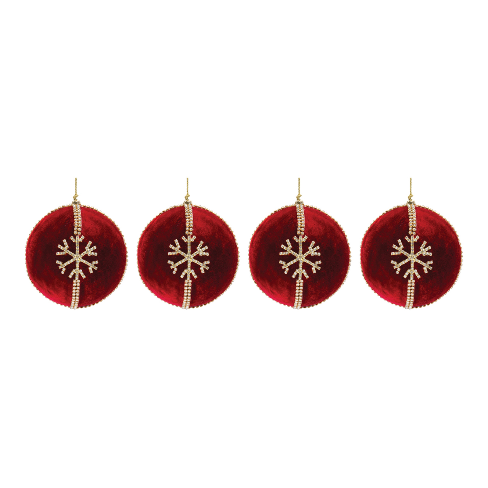 Adorn your Christmas tree and holiday decor with this stunning set of Jeweled Snowflake Ball Ornaments. Featuring 4 pieces, the festive red and chic gold tones paired with the jeweled design is the perfect combination to create a memorable display. The quality plastic and polyester composition and delicate gold string hanging accent is sure to endure for seasons to come. Whether you re adding a touch of cheer to your home or gifting to a loved one, these ornaments will definitely bring smiles.