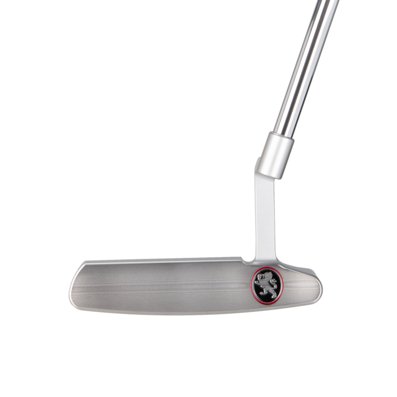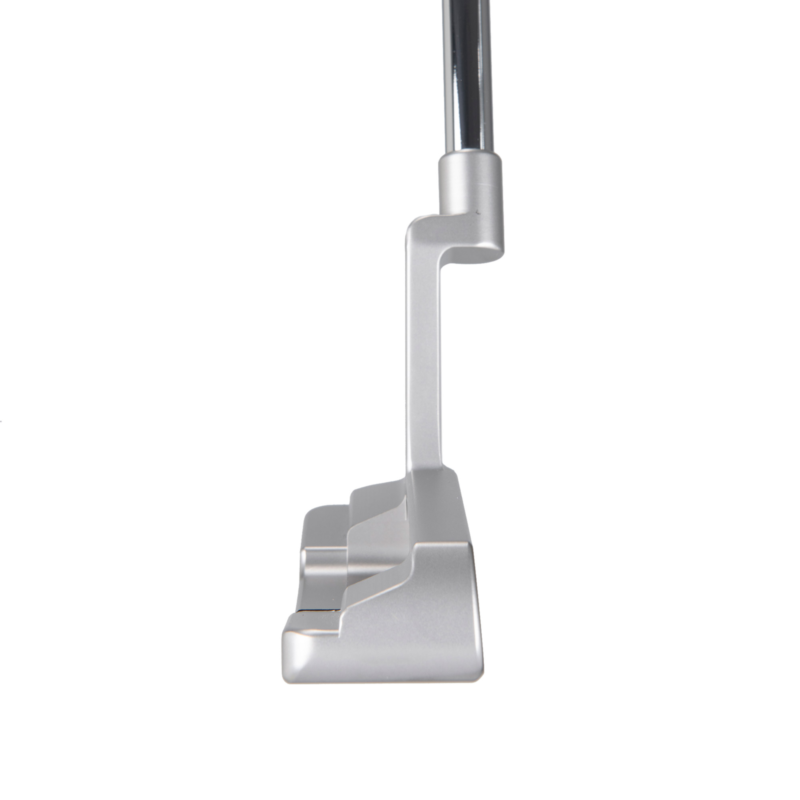 This is a blade style putter with a Plumbers neck made from 303 Stainless steel. Piretti Touring Pro Black Grip and a White head cover included.