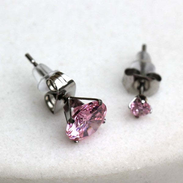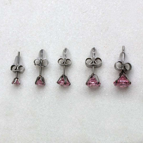 316L Surgical Steel Pink Round CZ Stud Earring.316L Surgical Steel Stud Earrings with finest prong set Cubic Zirconia.Each Earring comes with a metal clutch and a rubber clutch.A grooved post helps to prevent loss of the clutch.Available in 5 CZ sizes.