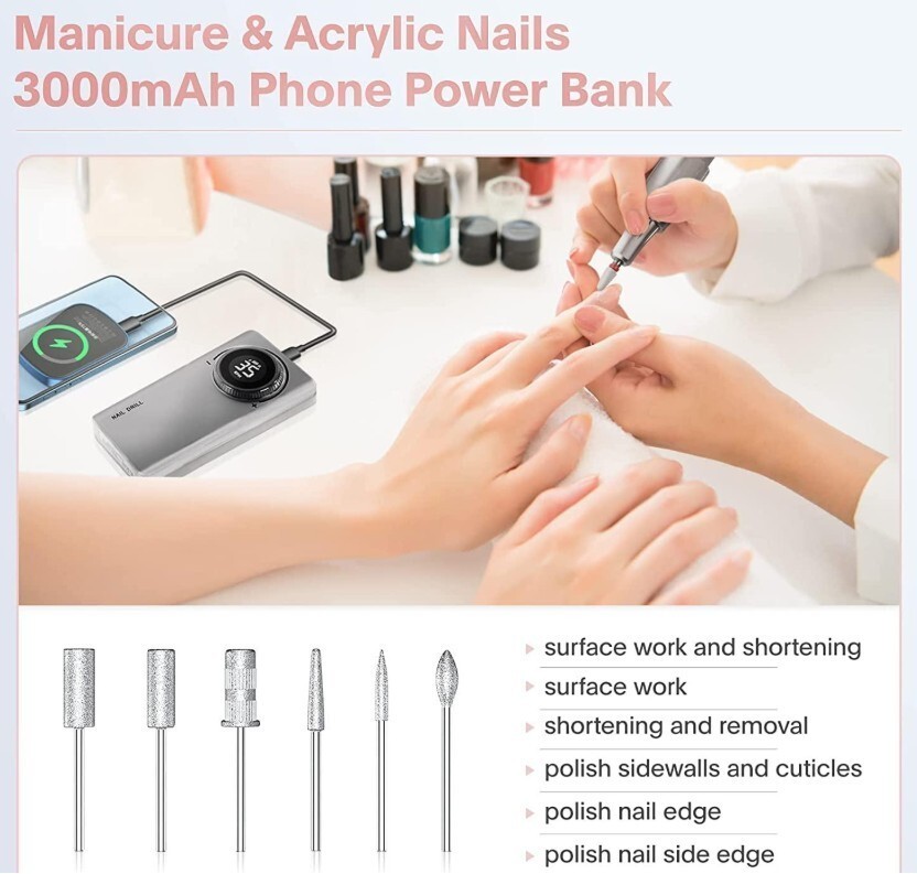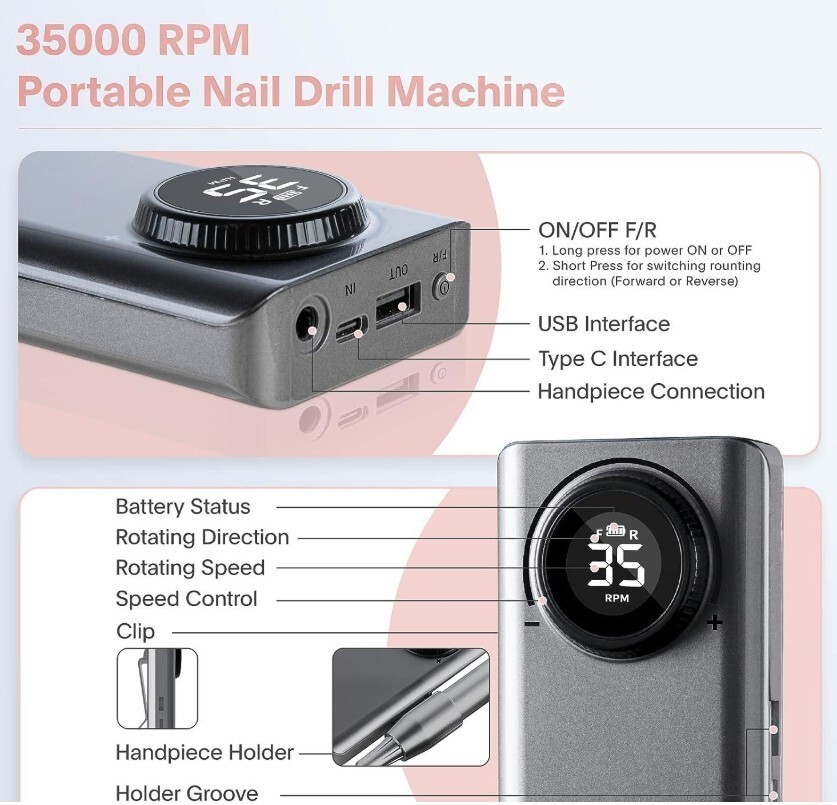 Portable Electric Nail Drill Machine, Professional 35000 RPM USB Manicure Pedicure Drills for Acrylic Nails Gel Polishing Shape Tools
