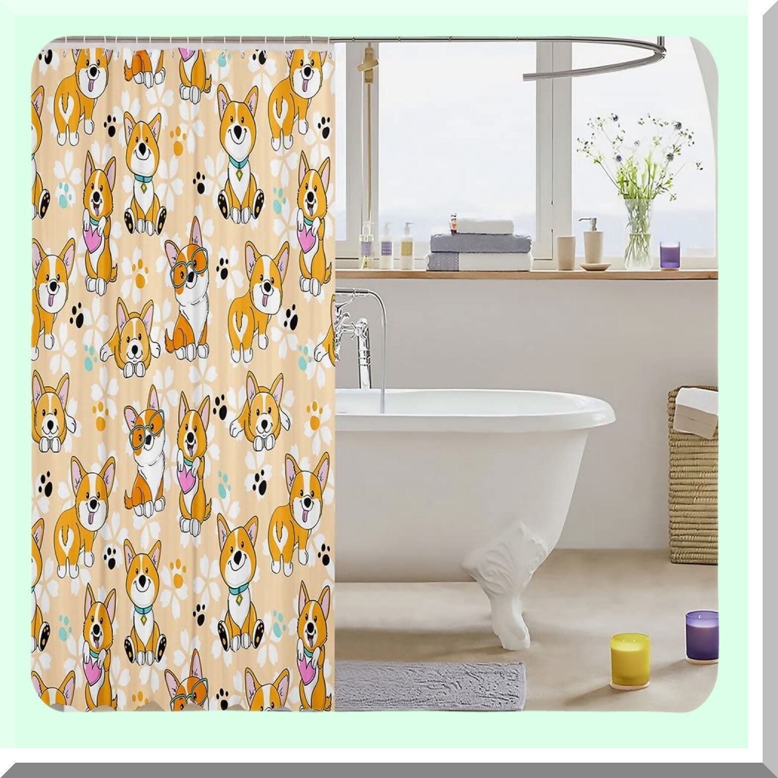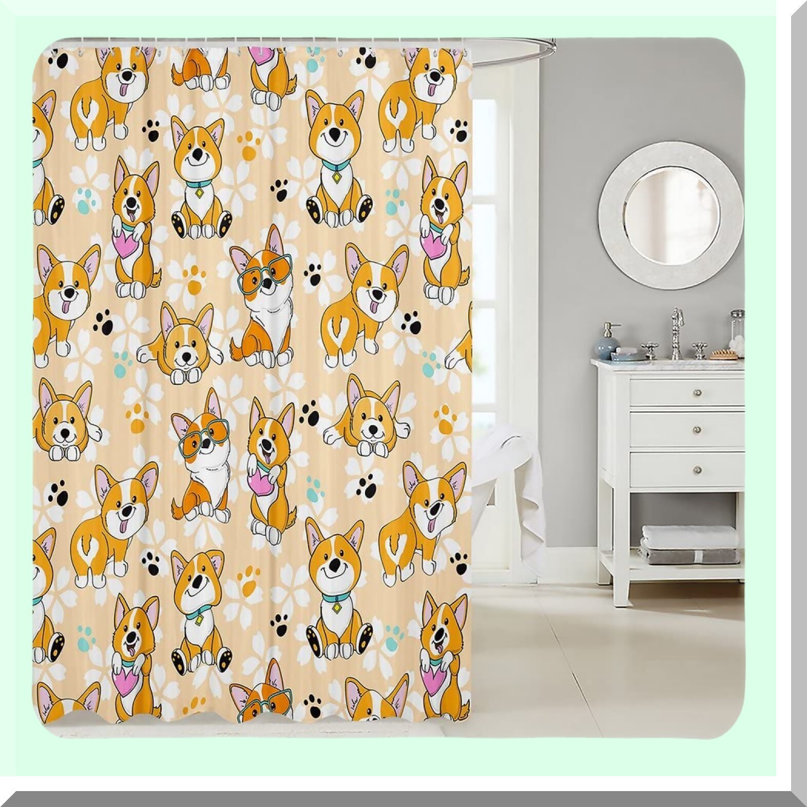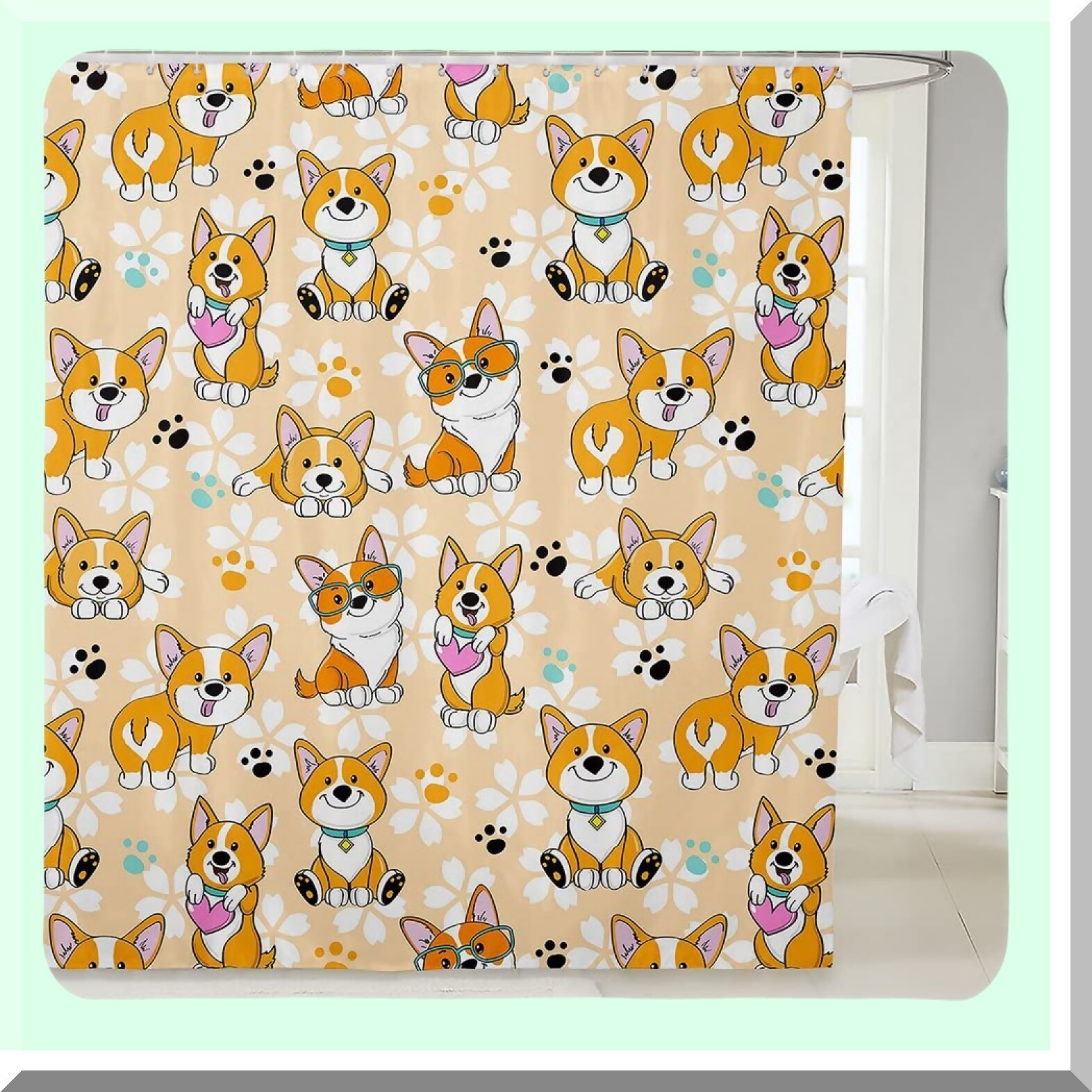 This shower curtain features a cute corgi design with a cartoon dog paw pattern, perfect for kids, teens, boys, and anyone who loves playful, kawaii artwork. Made from 100% polyester fabric, it is waterproof, durable, and resistant to wrinkles, ensuring long-lasting use. The vibrant digital print showcases a smiling dog in bright yellow, adding a cheerful touch to any bathroom decor. Measuring 72" wide by 72" long, it includes 12 hooks for easy hanging and fits standard bathtubs. Its high-quality eco-friendly ink provides vivid colors while maintaining a safe environment. The curtain allows light to pass through for a bright interior and offers privacy during showers. Suitable for bathrooms, windows, balconies, or as a decorative piece, it helps keep water splatters contained. Easy to clean with hand washing or wiping, this charming curtain makes a delightful gift for loved ones and a fun addition to any space.