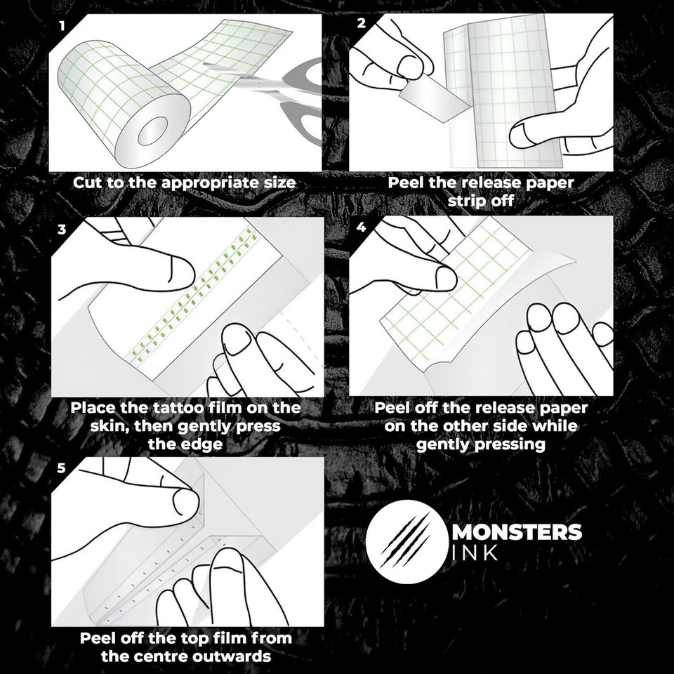 Features: Reusable,breathable,matte finish,waterproof,pressure-sensitive adhesive,latex-free,soothing,shielding,prevent cross-infection,locks in moisture,minimizes scabbing,preserves tattoo colors,secure adhesion,flexible adhesion,gentle and comfortable,easy to cut,easy to trim,flexibility,stretchability,peel-and-apply method,trusted by professionals,effective,reliable