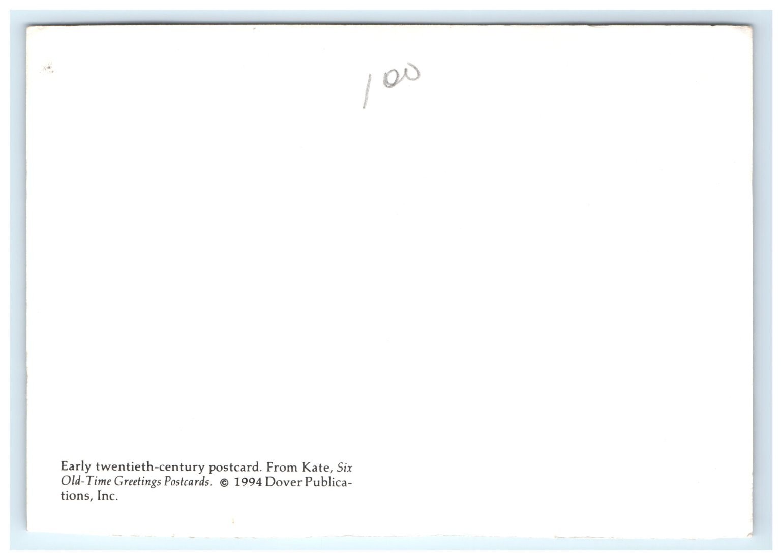 Produced as an original chrome lithograph on continental-sized paper (6 x 4 inches), this postcard captures the charming essence of antique greetings. Its decorative borders and detailed floral clusters, paired with the distinctive Gothic-style lettering, make it a collectible piece for enthusiasts of vintage ephemera and early postcard art. The back credits Dover Publications, linking it to a known source for classic greeting card reproductions.