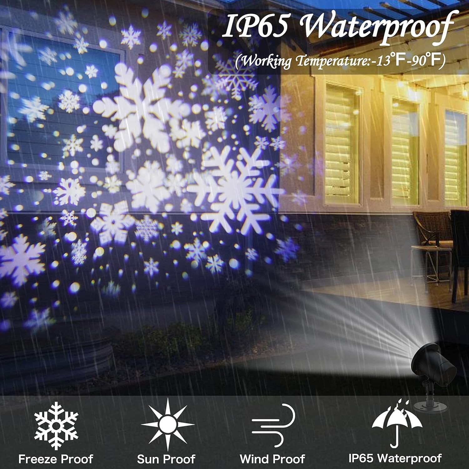 Outdoor Christmas Projection Light: IP65 Snowflake Projector Lights with IP44 power adapter. Can work in extreme weather from -13? to 90?. Can also be used safely in rain and snow (Please do not immerse directly into water). It Can perfectly decorate your house, garden, yard, bedroom, living room, etc.