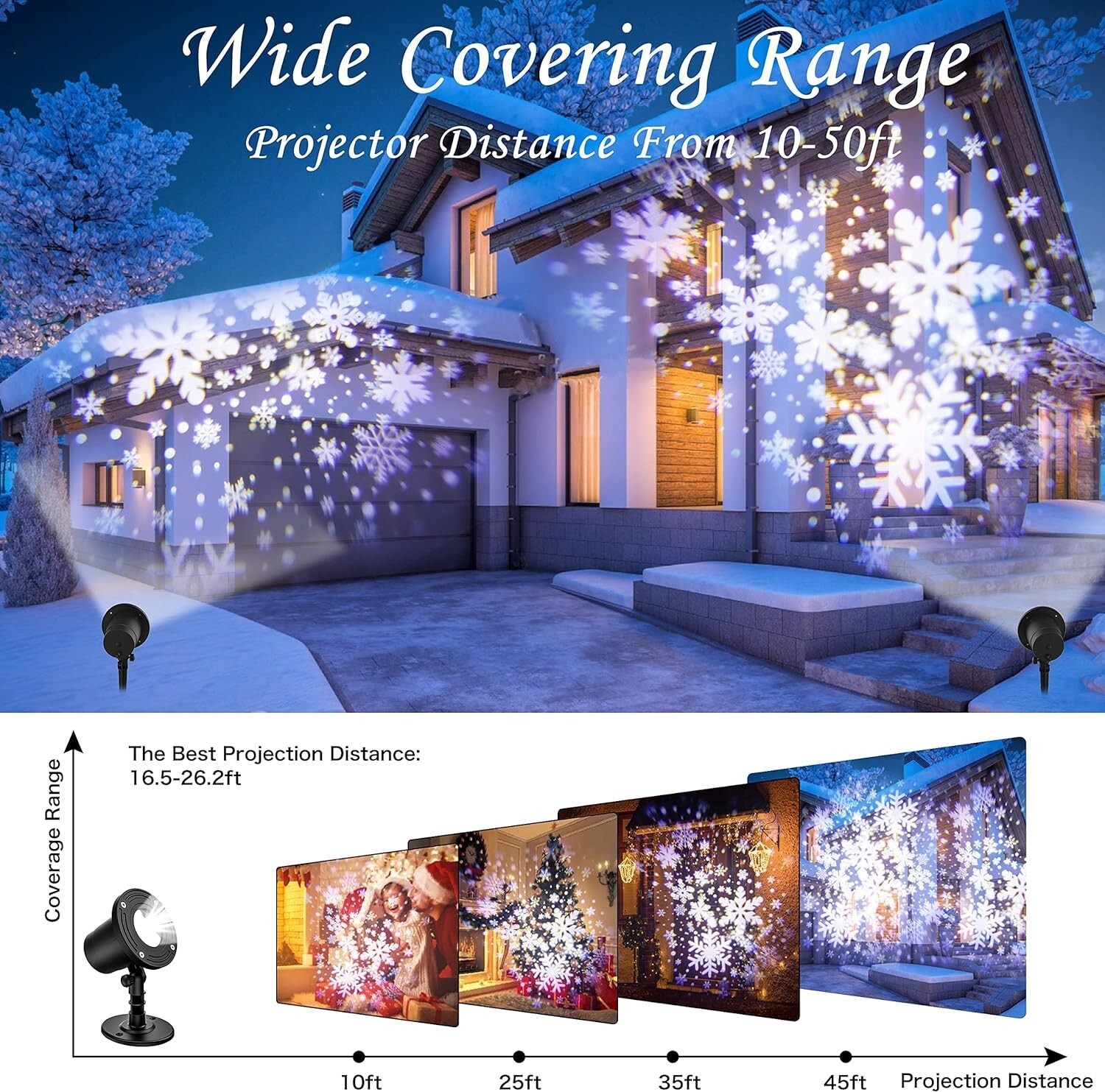 Large Projection Area: The largest projection area of 50?(538sq.ft). LED Christmas projector lights can be adjusted up and down 170 , easy to adjust the angle. The farther the distance, the larger the projection range of the LED snowflake lights. The recommended best projection distance is 16.4-26.5ft.