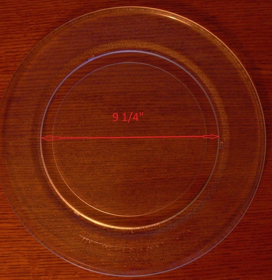 This replacement microwave glass tray has no tabs around the inner edge of the roller ring. Roller ring track measures 9 1/4" outside diameter.