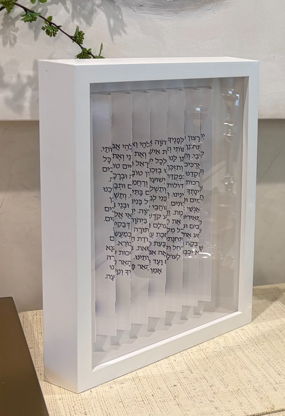 This sculpture, titled "Shabbat Candles with Prayer," depicts the Shabbat candles. The artwork imbues the viewer with serenity and devotion. As viewers shift their perspective, they are greeted with the prayer one recites when lighting the candles. This payer focuses on future generations, praying for the well-being of one's children.