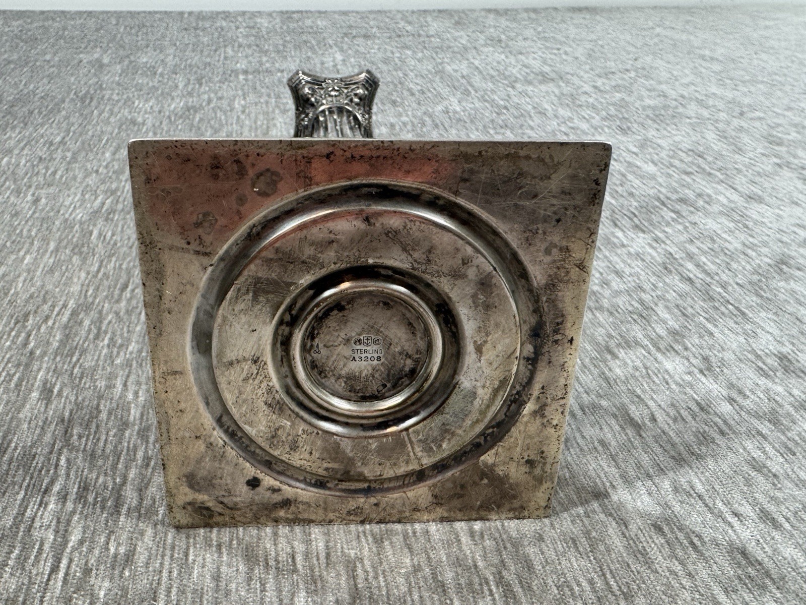 Has tarnish as seen. Engraving on one side of the base as seen. Small dings in the silver in various areas.