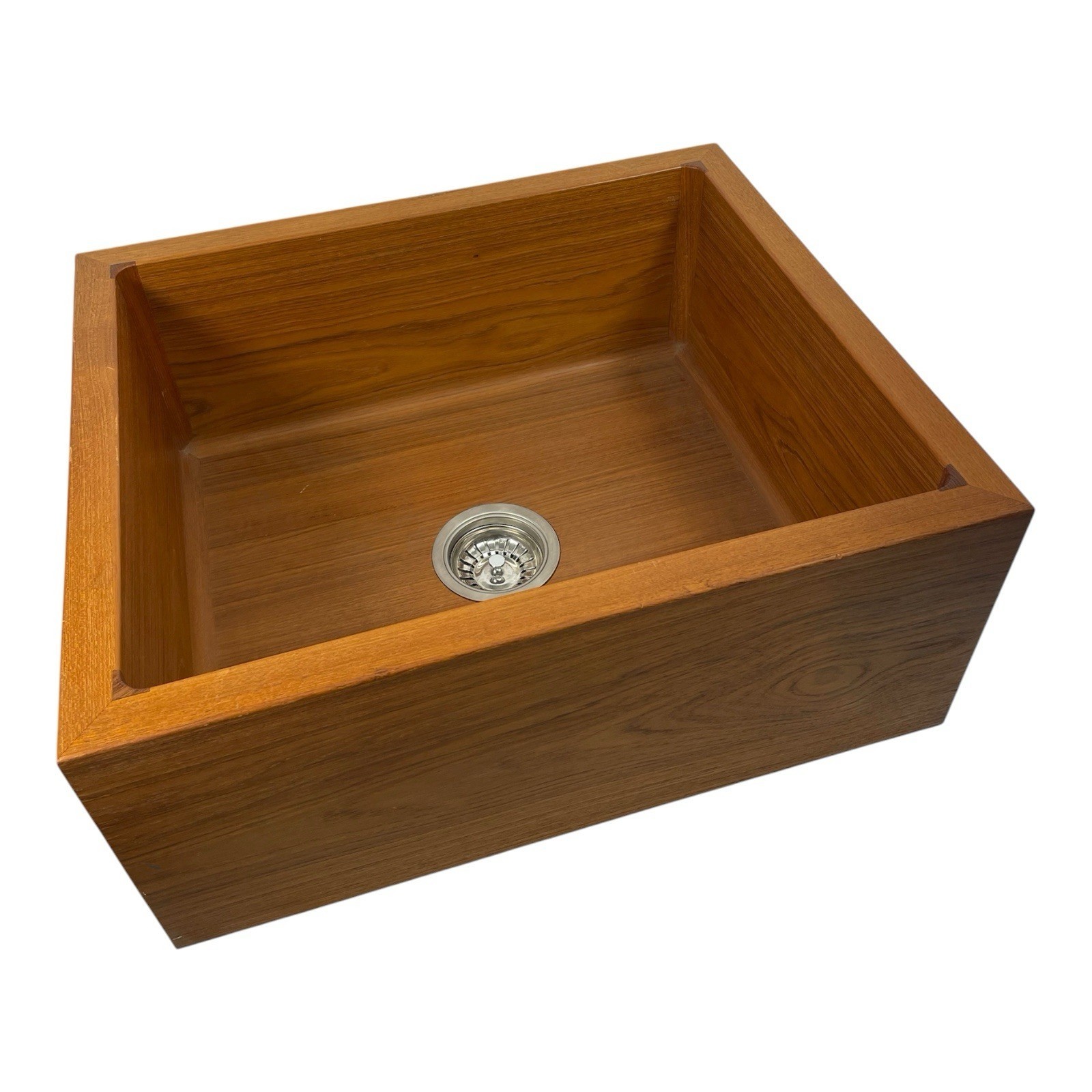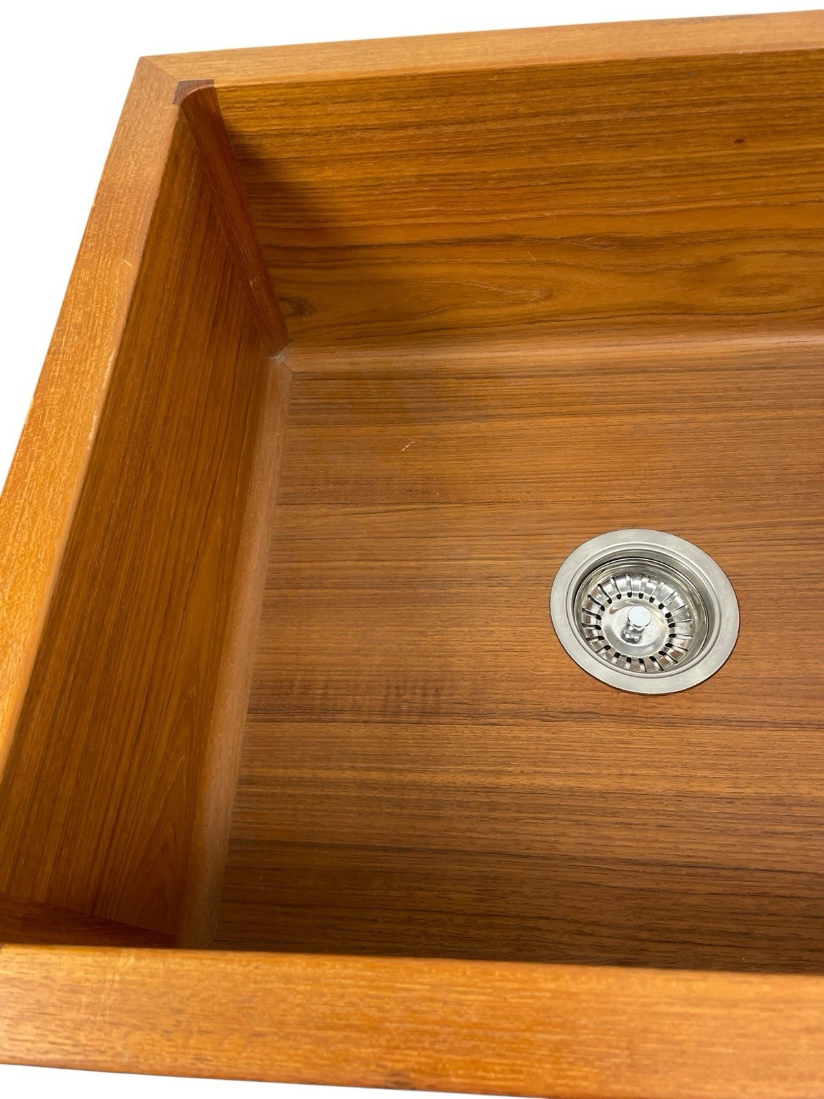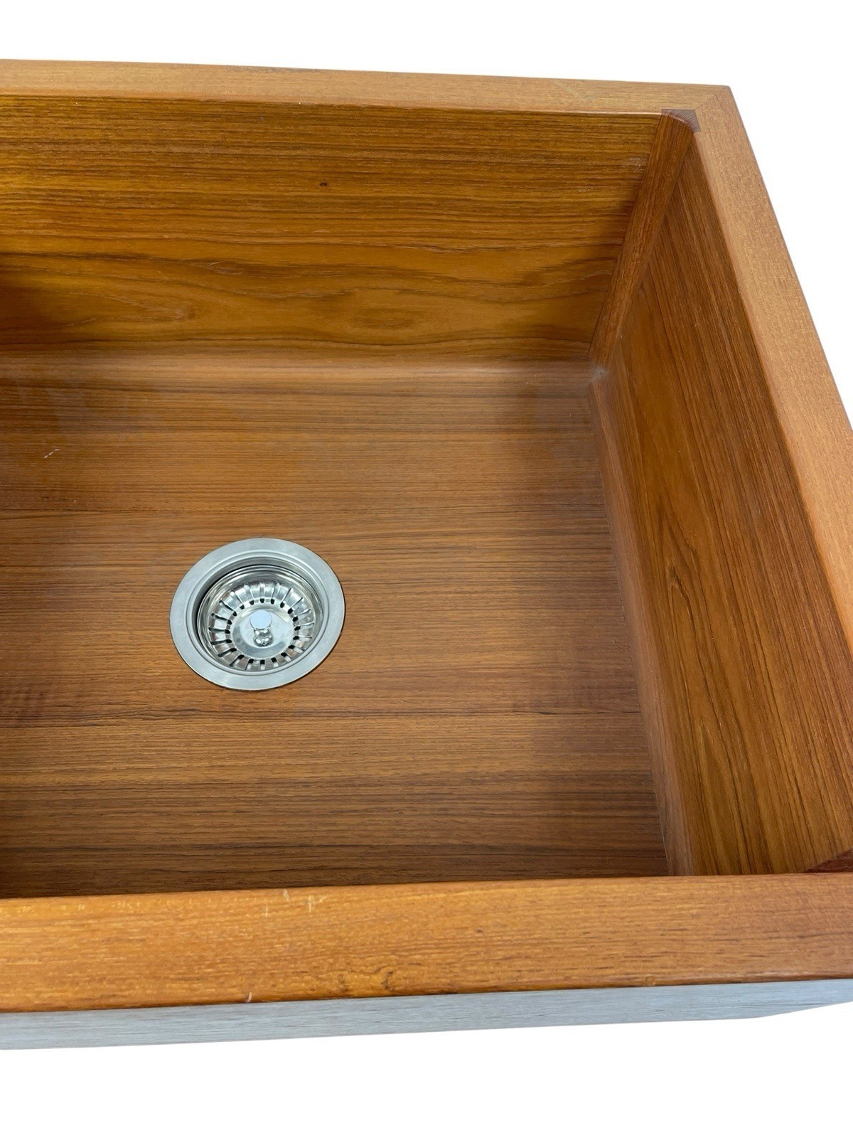 This beautiful teak sink is constructed from solid, sustainably harvested Teak and is available in two depths. The standard size is 7 3/4" deep overall, while the Belfast model (see below) measures 10" deep. The internal corners of the sinks are rounded to a radius of 3/4" for easy cleaning. Each sink comes with steel brackets for attaching to the underside of a countertop. The sink can also wall mounted, on a countertop, or in a cabinet with the front exposed in the farmhouse style. Comes with a pre-installed brushed stainless steel basket strainer drain. An overflow feature can be ordered at an additional cost.