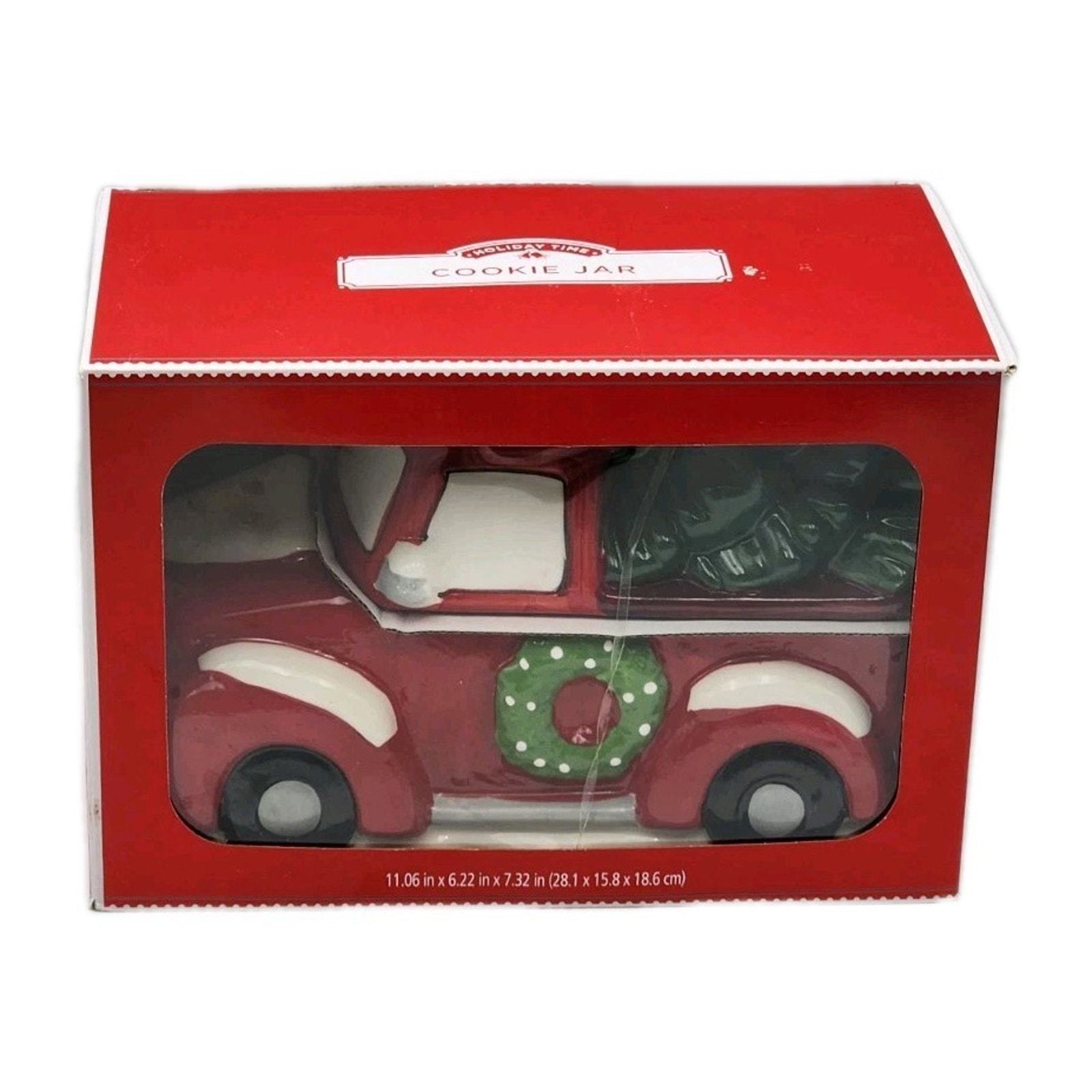 Holiday Time Christmas Tree Red Truck Cookie Jar Green Wreath Hand Painted