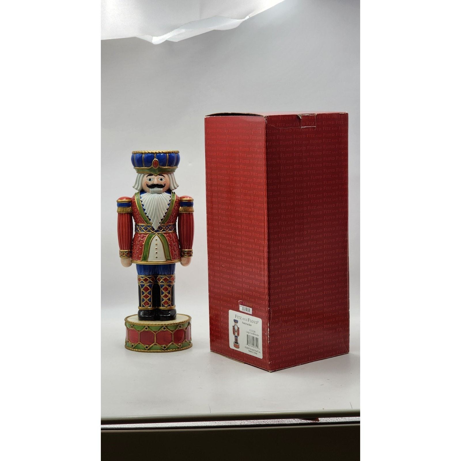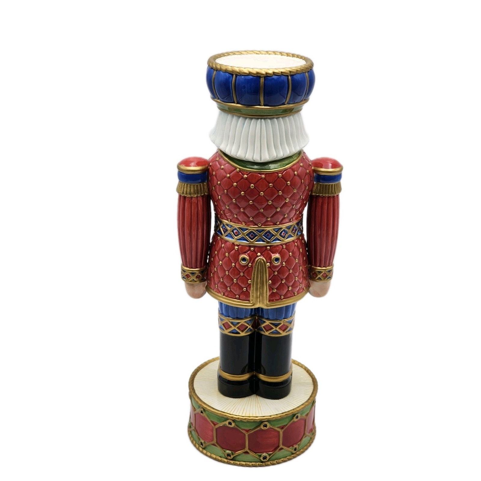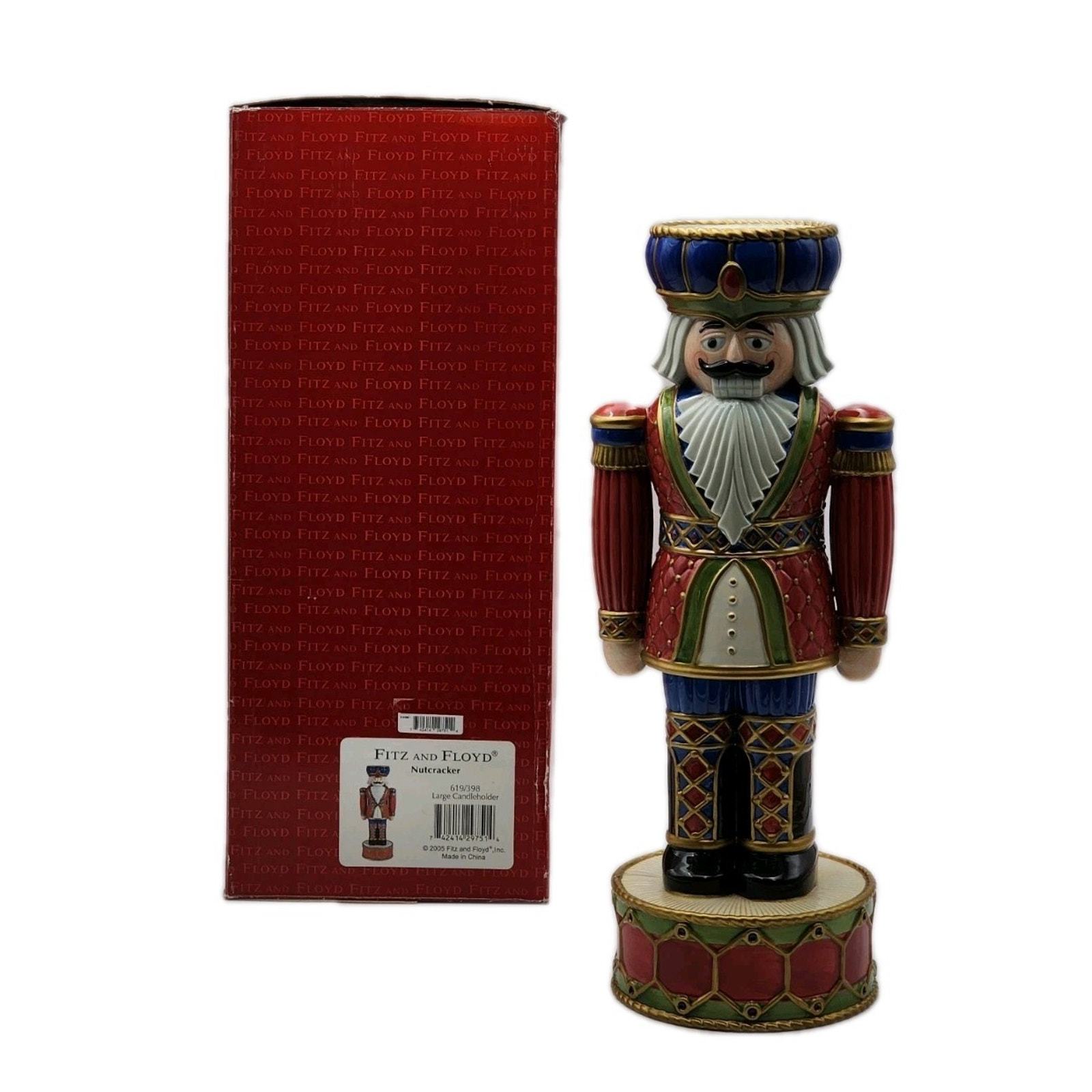 The Fitz and Floyd Nutcracker Large Candleholder is a vintage 2005 collectible that stands at 16 inches tall in its original box. It is a traditional, artist-designed piece of art pottery featuring a nutcracker shape, perfect for Christmas decor. This decorative ceramic and porcelain item from the Nutcracker Collection by Fitz and Floyd is a one-of-a-kind piece that adds a festive touch to any holiday display.